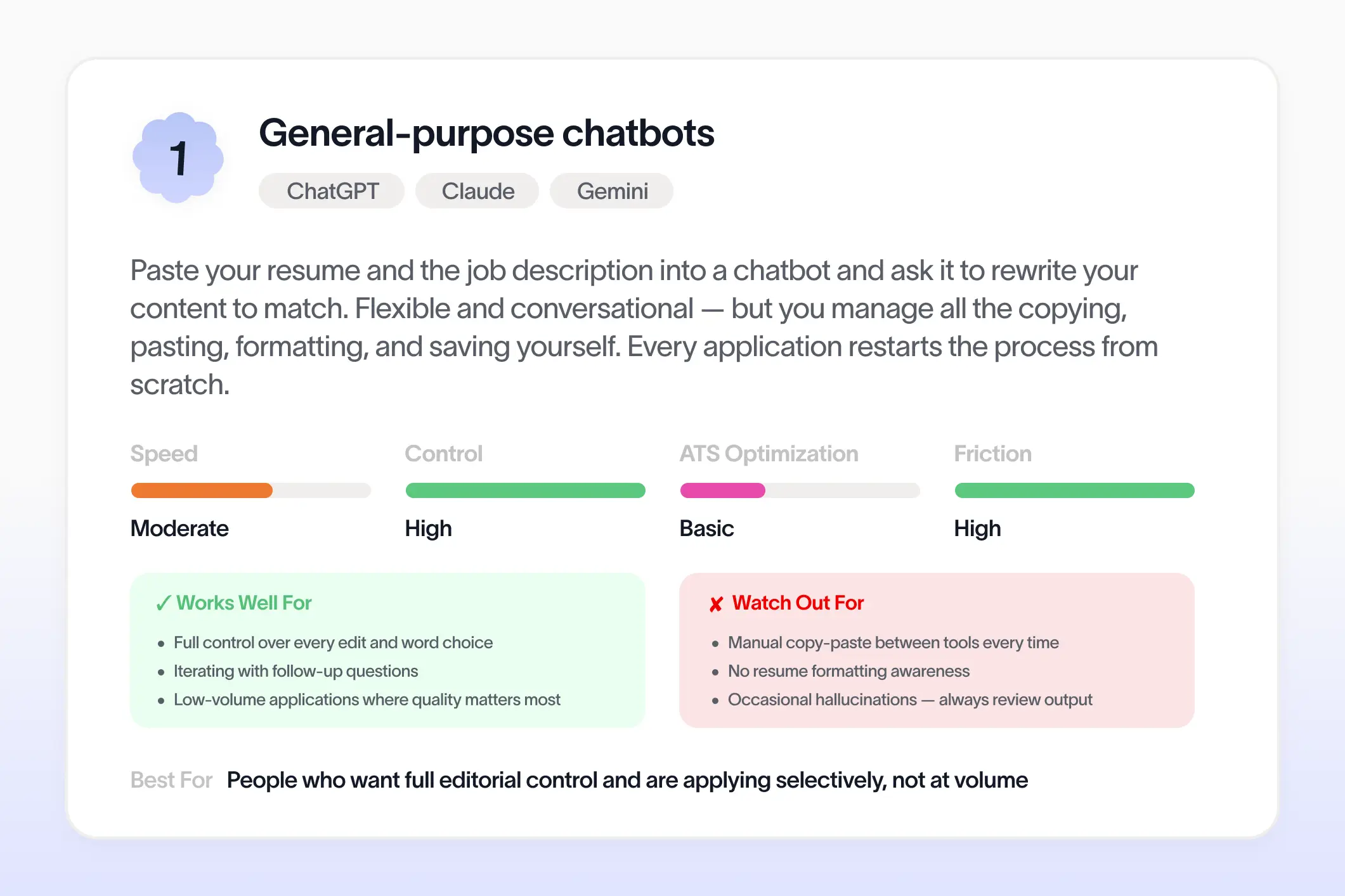 These tools have advantages over general chatbots: they understand resume structure, they know what ATS systems look for, and they handle formatting automatically. Many include match scoring so you can see how well your resume aligns with the posting before you apply.
