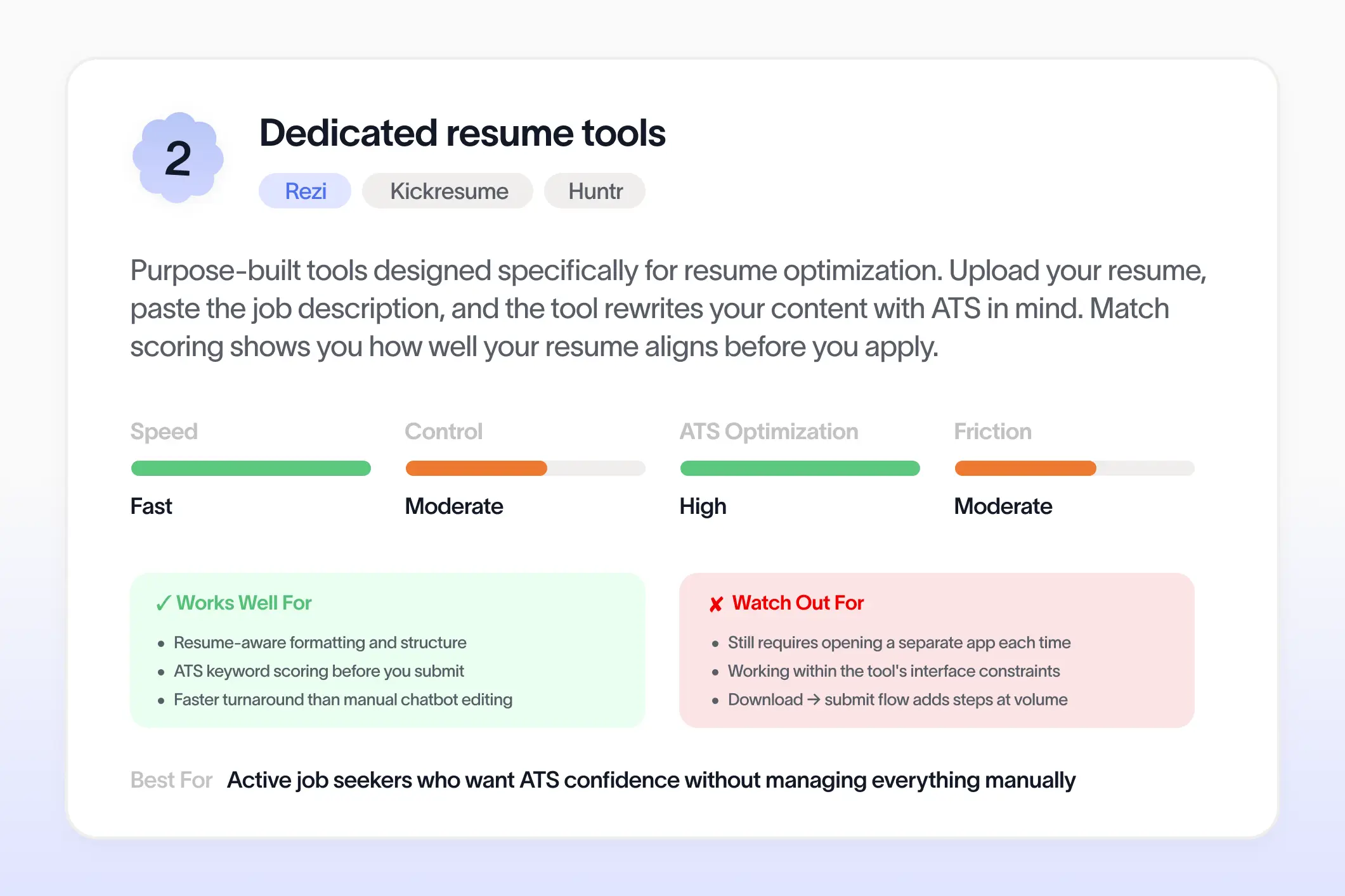 Purpose-built tools like Rezi, Kickresume, Huntr, and others are designed specifically for resume optimization. You upload your resume, paste a job description, and the tool rewrites your content with ATS optimization in mind.