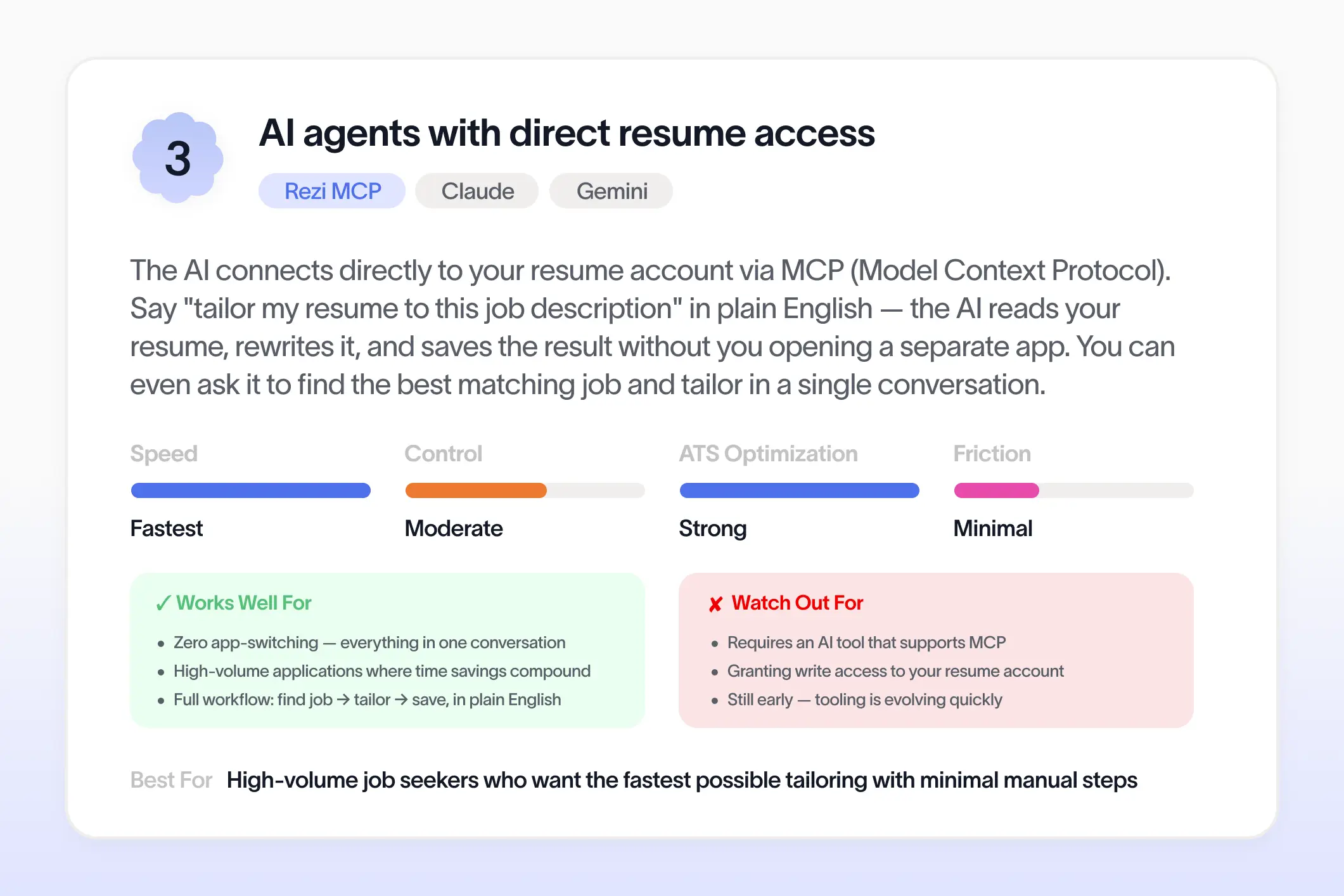 The advantage is speed and integration. The disadvantage is that you need an AI tool that supports MCP, and you need to trust the AI with write access to your resumes. For job seekers applying at high volume, the time savings compound quickly.
