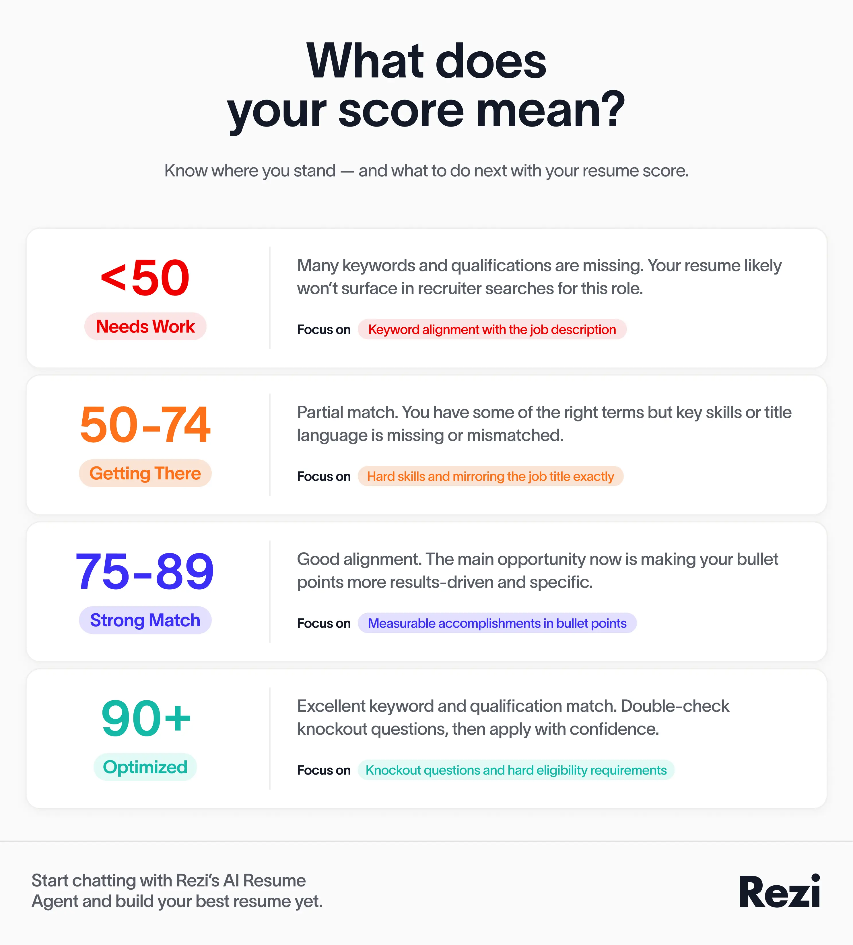 The Rezi Score shows you if your resume is ready for job applications and how you compare to others. It evaluates your resume across these key areas: