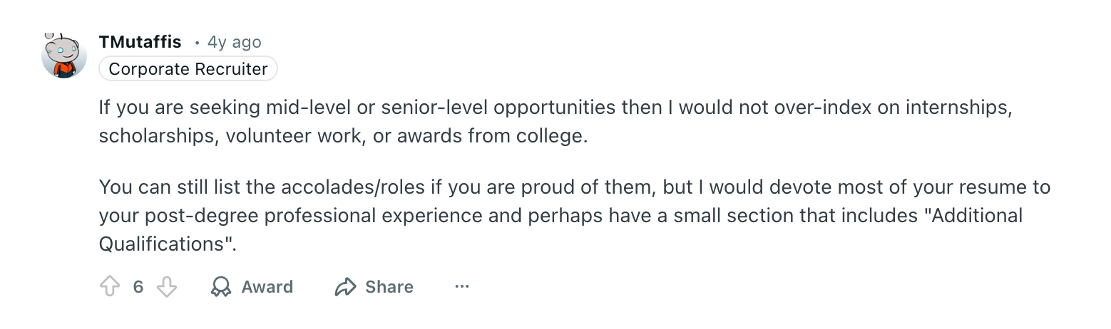 That said, awards shouldn’t be the focus of your resume. Recruiters still care most about what you can do and what you’ve done in your professional roles, so awards should support your story, not replace it.