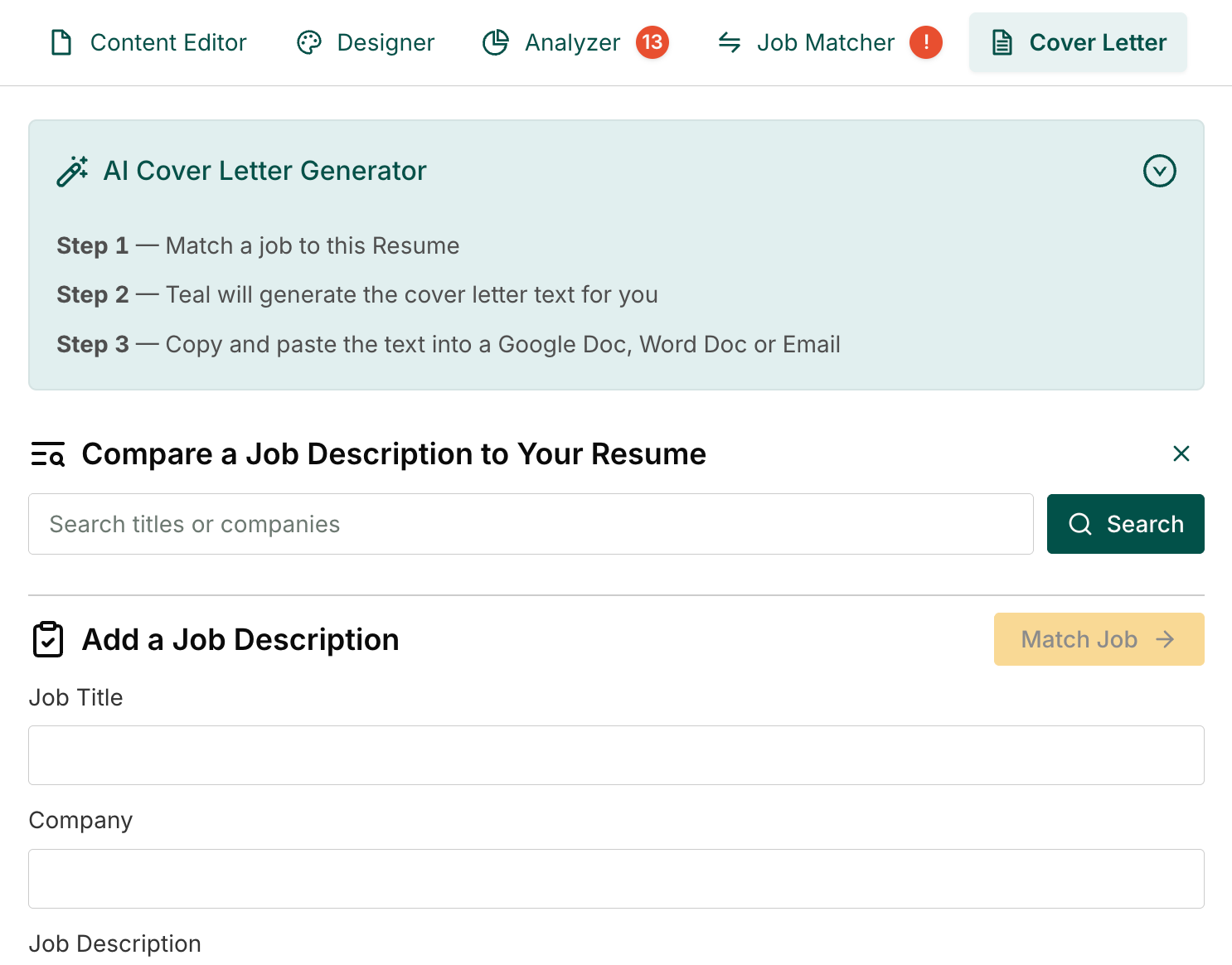 Teal is a full job application management platform with resume and cover letter tools. It takes longer to set up because it wants your resume uploaded and parsed into its system, but once you’re in, you can generate cover letters that are linked directly to your resume.