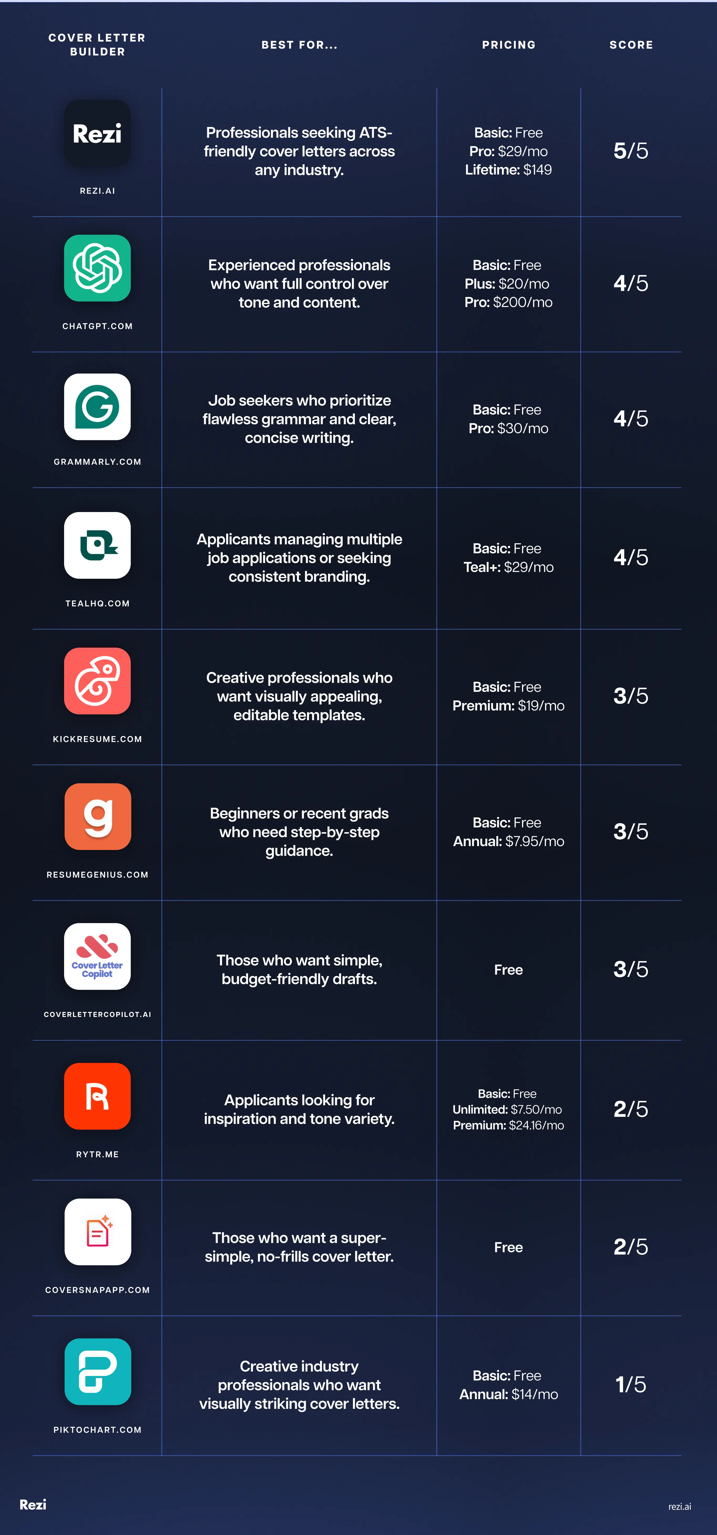 Let’s dive into my honest reviews of the top AI cover letter builders. This guide will cover: