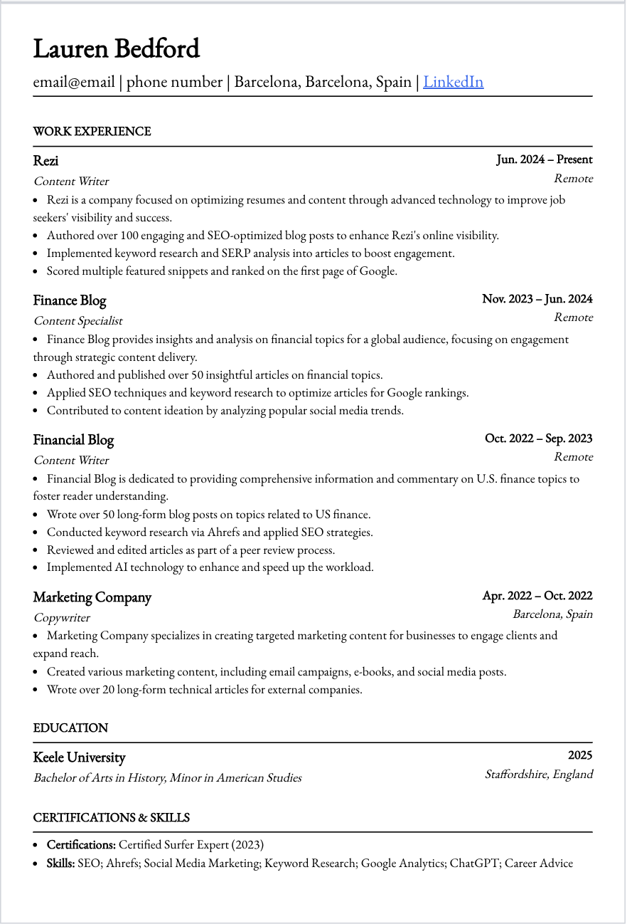 Lauren Bedford is a seasoned writer with a track record of helping thousands of readers find practical solutions over the past five years. She's tackled a range of topics, always striving to simplify complex jargon. At Rezi, Lauren crafts genuine and actionable content that guides readers in creating standout resumes to land their dream jobs.