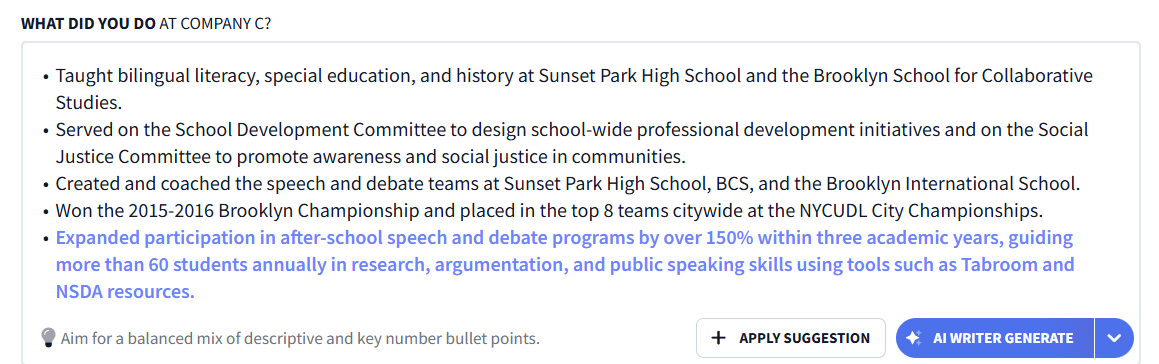 Need help putting together your experience section? Try our AI Bullet Point Editor to improve bullets you already have, or use the AI Bullet Point Writer to generate new, metric-driven bullets: