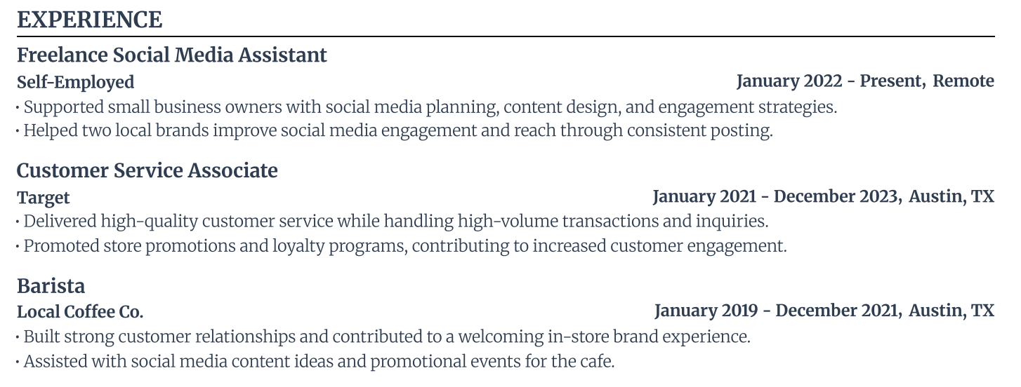 Even though a functional resume focuses on skills, it still helps to have a work history section, even if it’s on the smaller side. Employers want to see proof that you’ve worked in professional environments and applied your abilities in the real world.