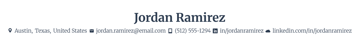 Begin with the basics. Your contact details sit at the top of your resume, under your name and header. Keep it simple, easy to scan, and make sure you don’t over-share (aka, don’t use your full home address).