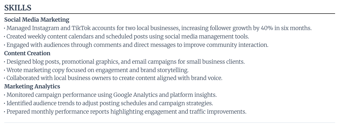If you recently graduated, you can add more to your education section to back up your skills. And yes, abilities learned from extracurricular activities or relevant coursework all count if you’re new to job hunting (just keep it relevant to the role).