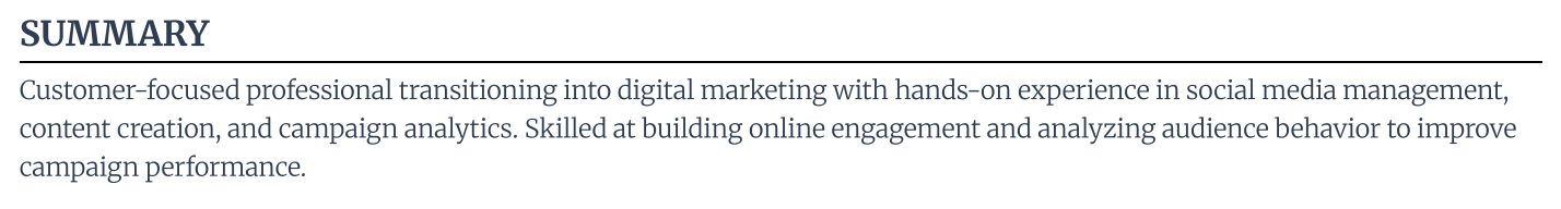 Don’t panic if you’ve just graduated or don’t have many professional achievements yet. Career changers and recent graduates can opt for a resume objective instead, which focuses more on career goals and transferable skills to show potential.
