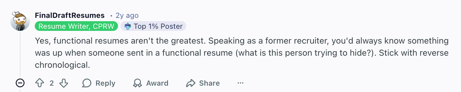 Most recruiters prefer a reverse-chronological format since it’s more familiar and therefore easier to scan. Hiring managers usually want to see a clear timeline of your work experience and how you’ve progressed in your career. A functional format can make that harder to spot quickly, especially when recruiters are scanning dozens of resumes in a short time.