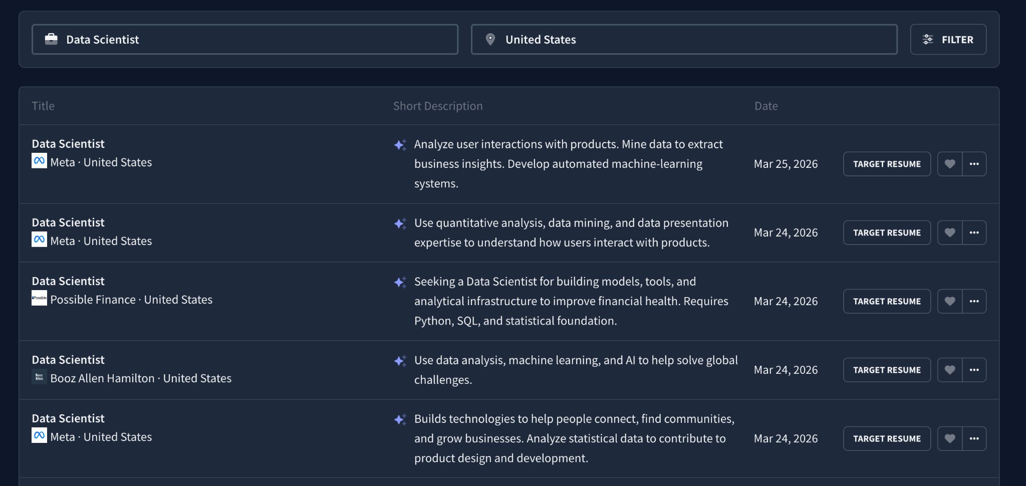 You can use tools like Rezi Job Search to help you find data science roles in your area. Just enter the job title and location, and it'll pull data job listings directly from company websites. You can even use this to help you tailor your resume for the specific job description.