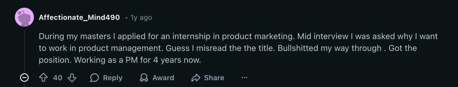 There are tons of interesting stories about how people break into product management. One Reddit user even shared that they applied for a PM internship, basically waffled their way through the interview, and somehow still landed the role, which is a level of proof that confidence and curiosity can go a long way.