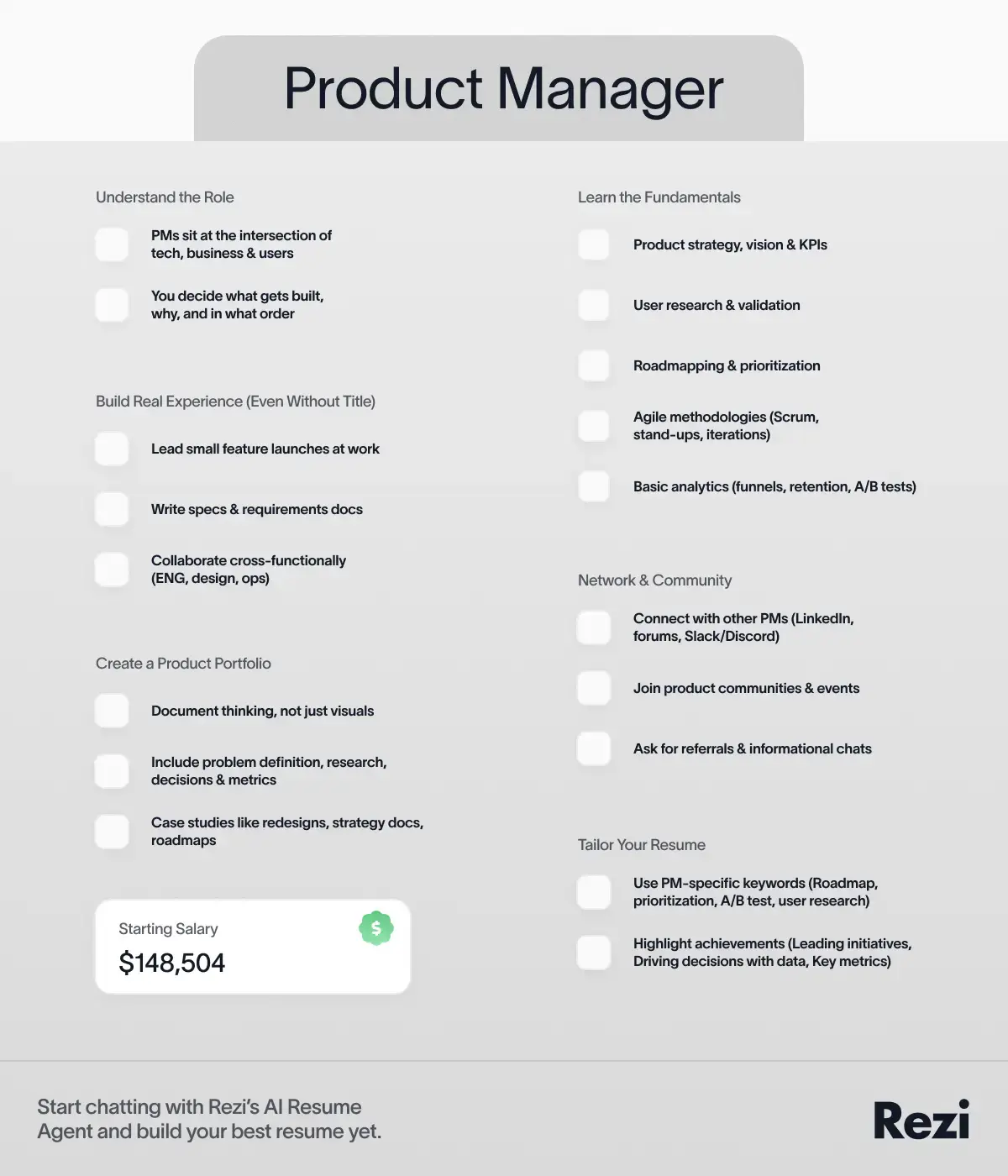 Here’s how to become a product manager: learn the fundamentals of product management, build relevant skills, and create a strong portfolio. Next, tailor your resume with product-focused achievements and then network with other product management professionals. From there, apply for product manager roles and start preparing for product management interviews.