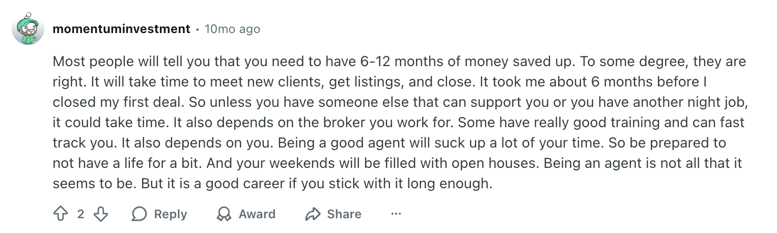 Be prepared for a slow start — some agents make their first sale in a month, while it might take others six months or more.