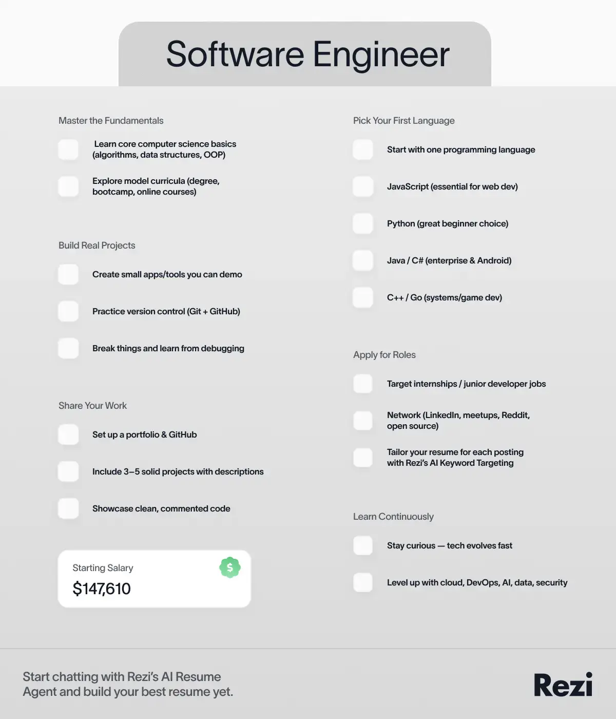 If you want to jump ahead and create a professional resume for software engineering job applications, you can get started with Rezi AI Resume Builder for free.