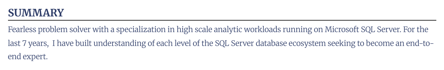 The summary sits at the very top of your resume and has one job: convince the reader to keep going. In three to four lines, it should highlight your most relevant skills and accomplishments.