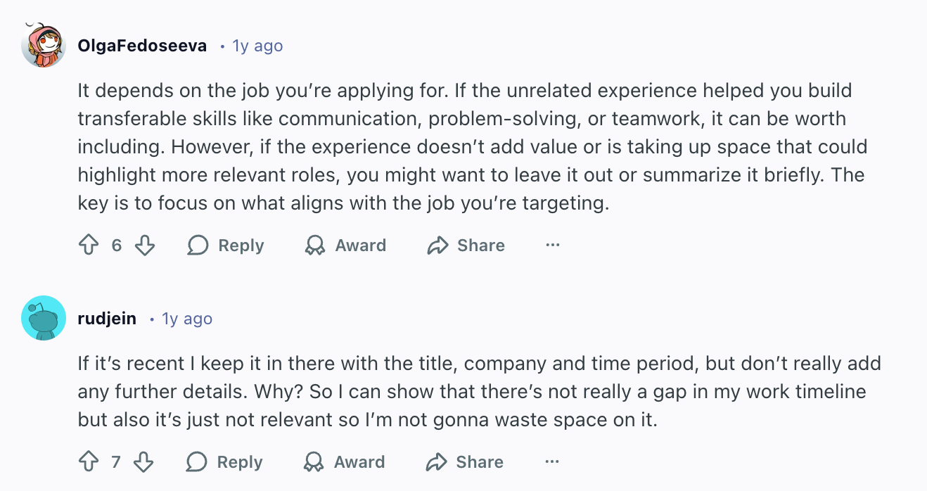 - Review older or outdated experiences and adjust them based on the skills required for your current career goals or new industry direction.