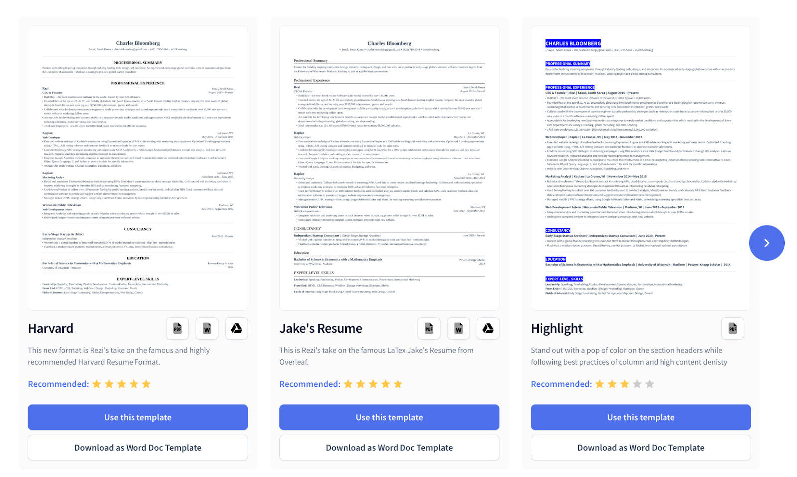 - Reverse-chronological layouts come ready-made inside Rezi, perfect for most job seekers, because they highlight career growth at a glance.