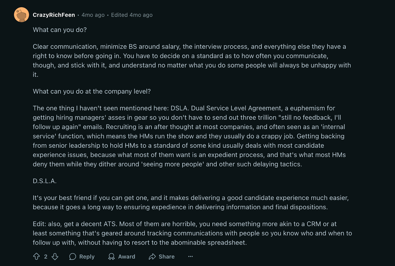 Another recruiter on Reddit mentioned how setting SLAs (Service Level Agreements) with hiring managers also makes a difference.