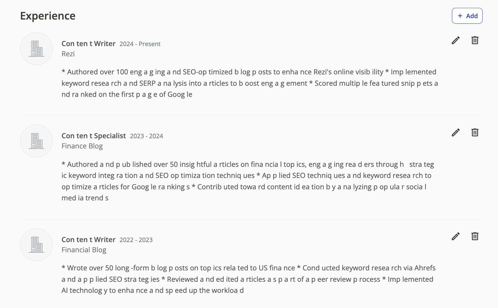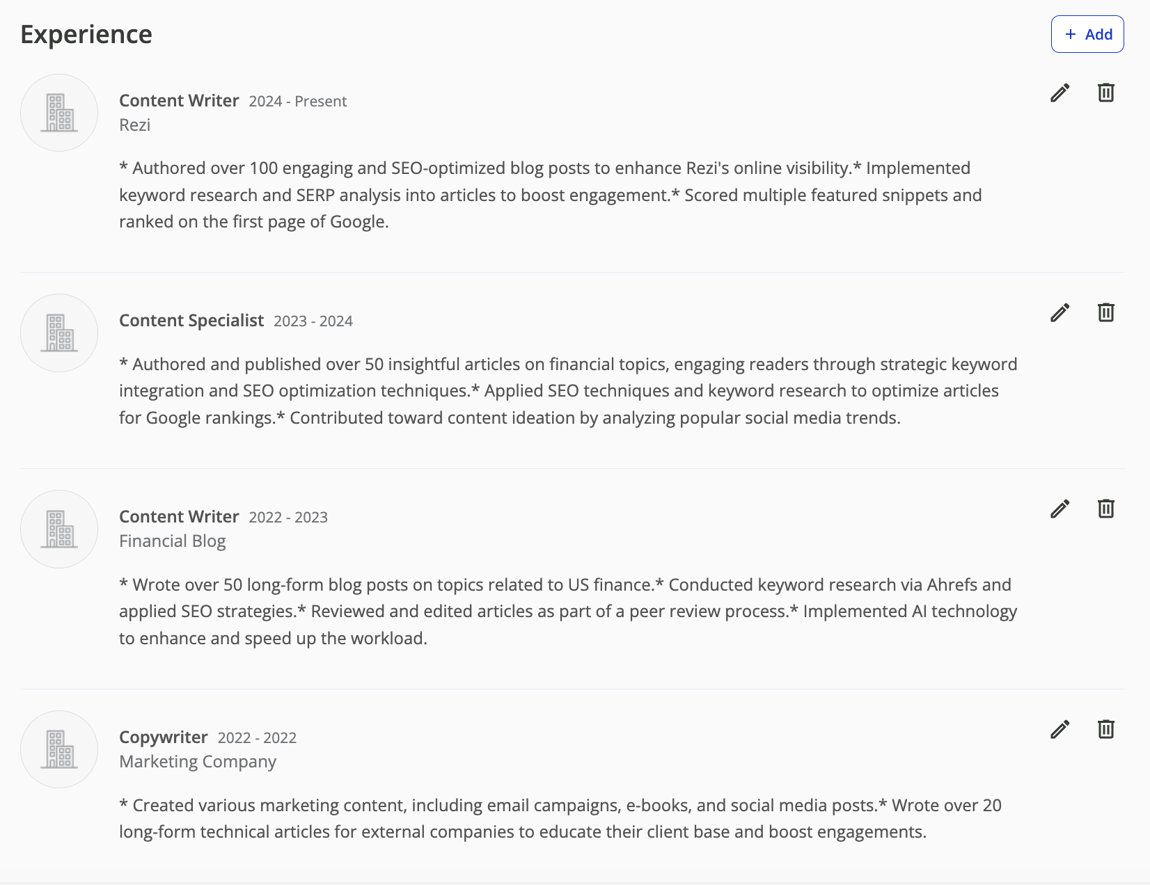 Stick with platforms that prioritize function and clarity over design flair. Rezi’s ATS templates are built with ATS in mind, with single-column layouts, organized sections, and no over-the-top design elements. Yes, we keep things minimal, but the point is to focus on your experiences and qualifications, not getting distracted by colors and skills charts.