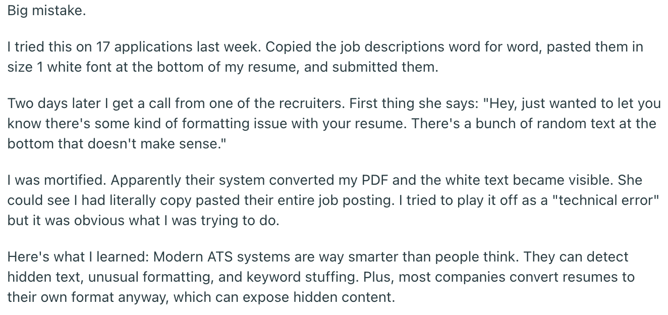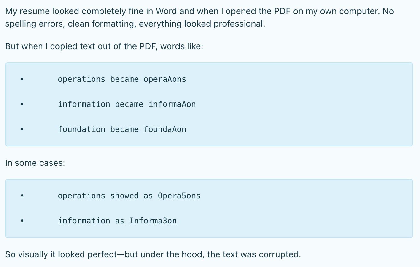 Don’t underestimate the power of using the right font. A Redditor explained in a recent post that the text from their resume PDF looked different when they copied it into an external document, potentially preventing the ATS from reading keywords.