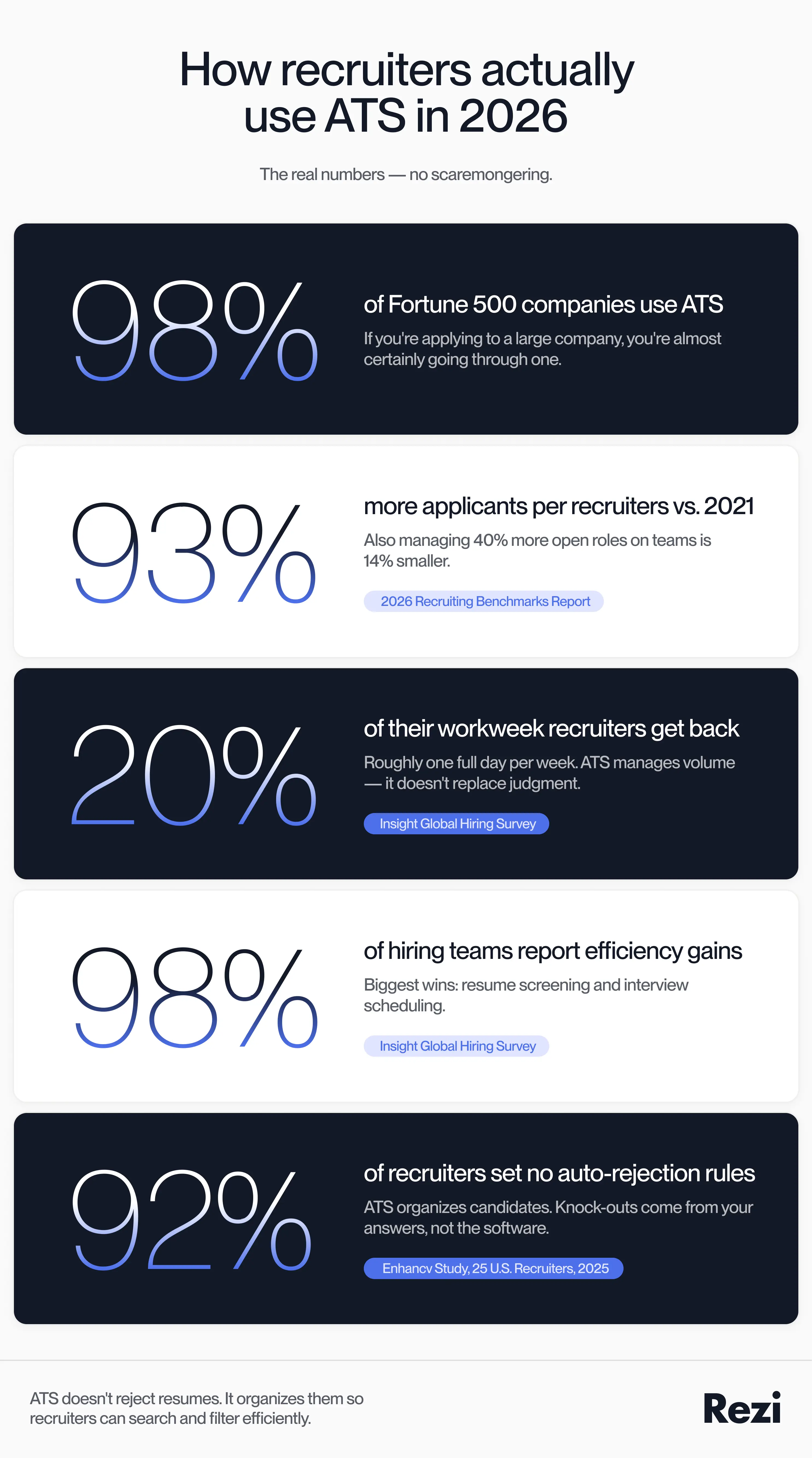 Recruiter workload and AI-adoption figures are drawn from third-party industry reports, including a 2026 recruiting benchmarks report, an Insight Global survey of hiring teams, and a Future of Recruitment Technologies 2025 report. The 97.8% Fortune 500 adoption figure is sourced from Jobscan's annual ATS usage research.