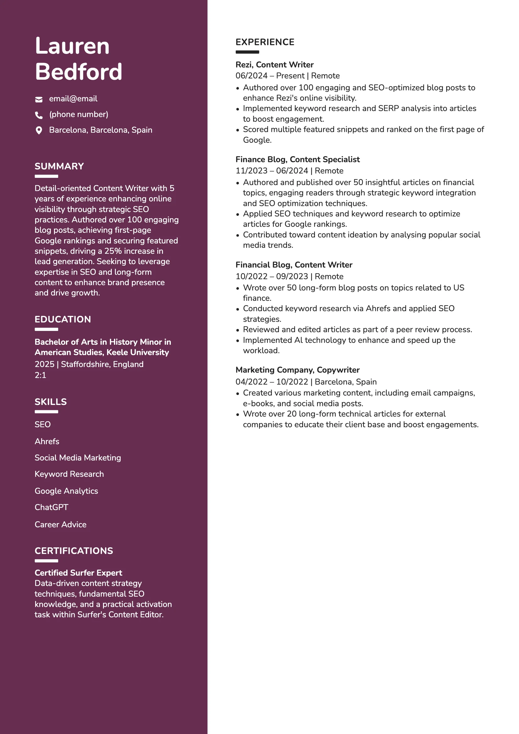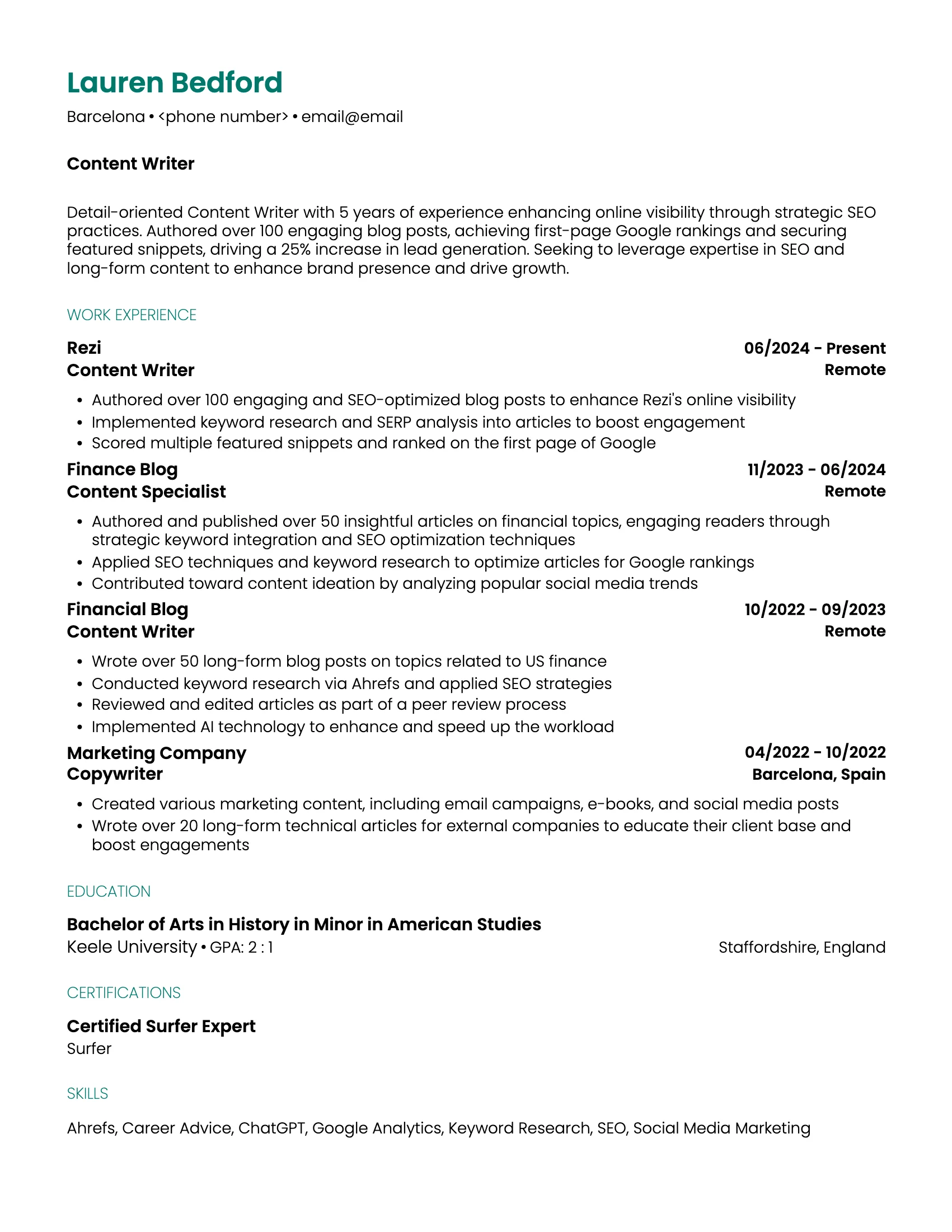 Lauren Bedford is a seasoned writer with a track record of helping thousands of readers find practical solutions over the past five years. She's tackled a range of topics, always striving to simplify complex jargon. At Rezi, Lauren crafts genuine and actionable content that guides readers in creating standout resumes to land their dream jobs.