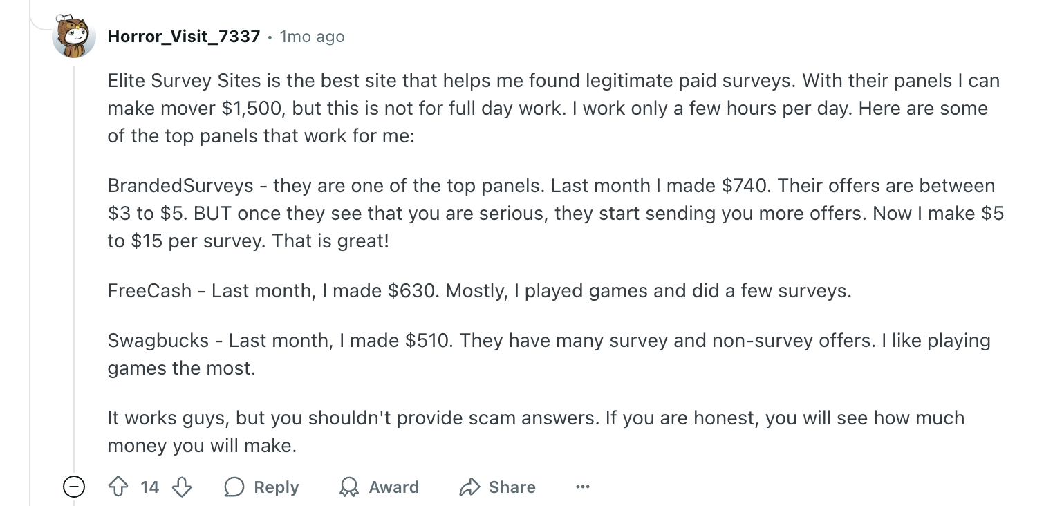 While surveys are easy to complete in your spare time, the income is typically low and won’t replace a full-time job. Most surveys compensate you anywhere from a few cents to a few dollars, so you’ll need to complete quite a lot to see anything significant.
