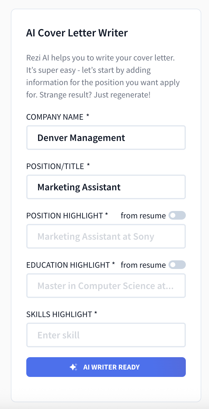 Cover letters can feel daunting when you don’t have years of experience. But Rezi’s AI Cover Letter Writer helps you quickly create a tailored, professional letter that highlights your enthusiasm, transferable skills, and relevant education. Emphasizing your potential and passion can go a long way when you’re new to the workforce.