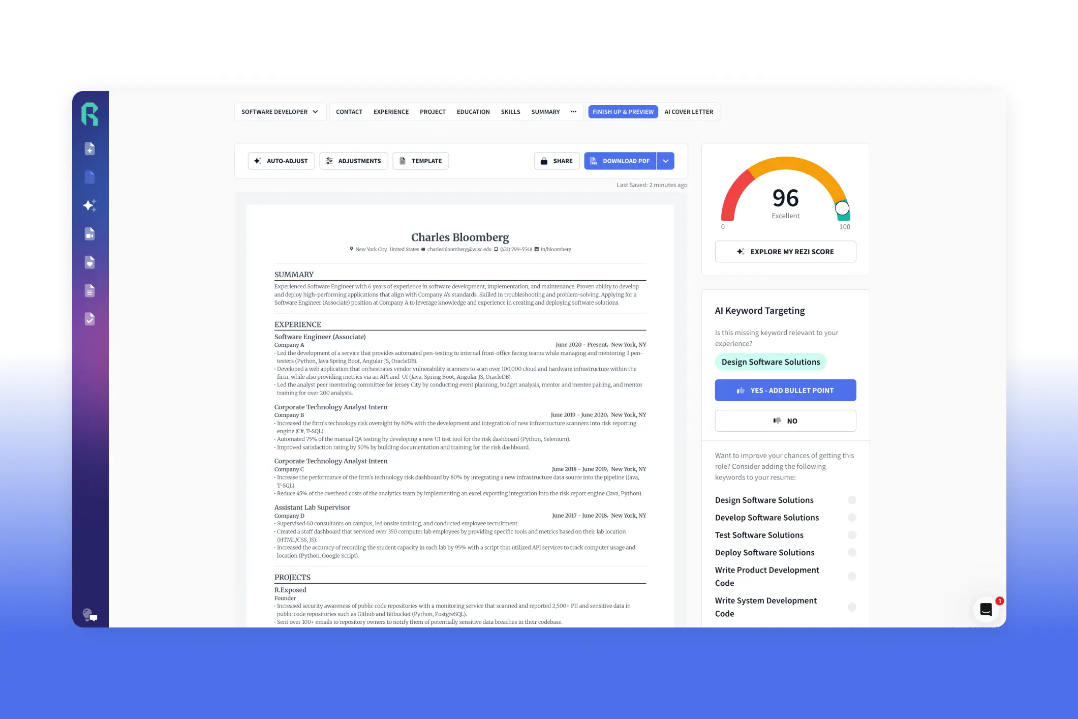 - Check for missing keywords with the AI Keyword Targeting tool, and have Rezi generate bullets for them automatically.
