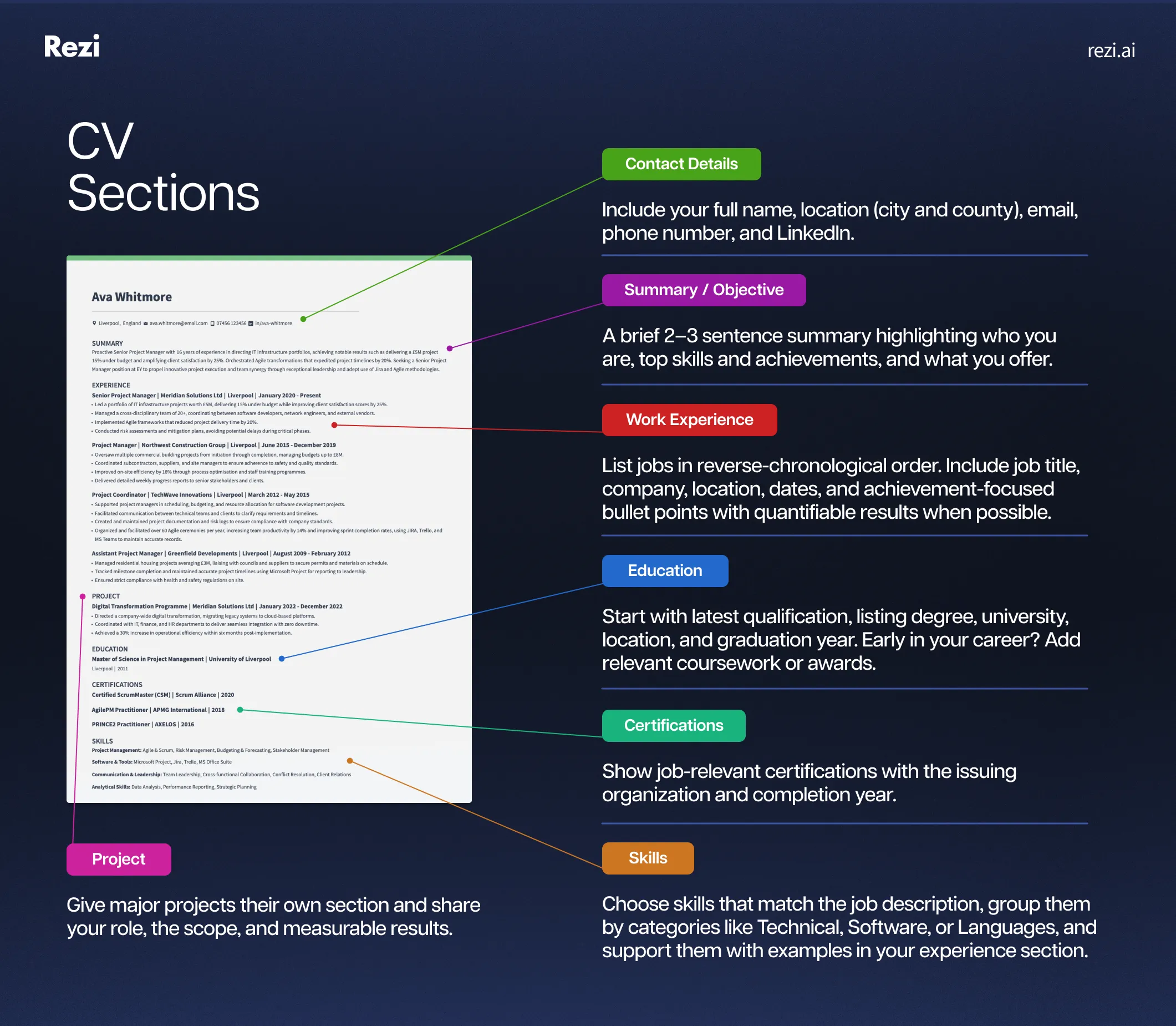 While everyone’s CV looks a little different, most follow a structure that makes it easy for employers and ATS to find the important details: