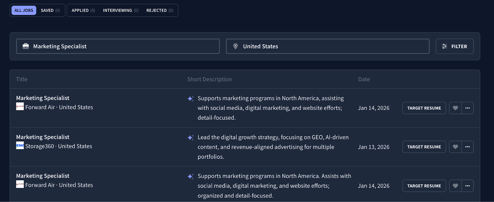 That’s why we built Rezi Job Search. It pulls job openings directly from company websites, and all you have to do is click “Target Resume” and Rezi will automatically tailor your resume to that specific role.