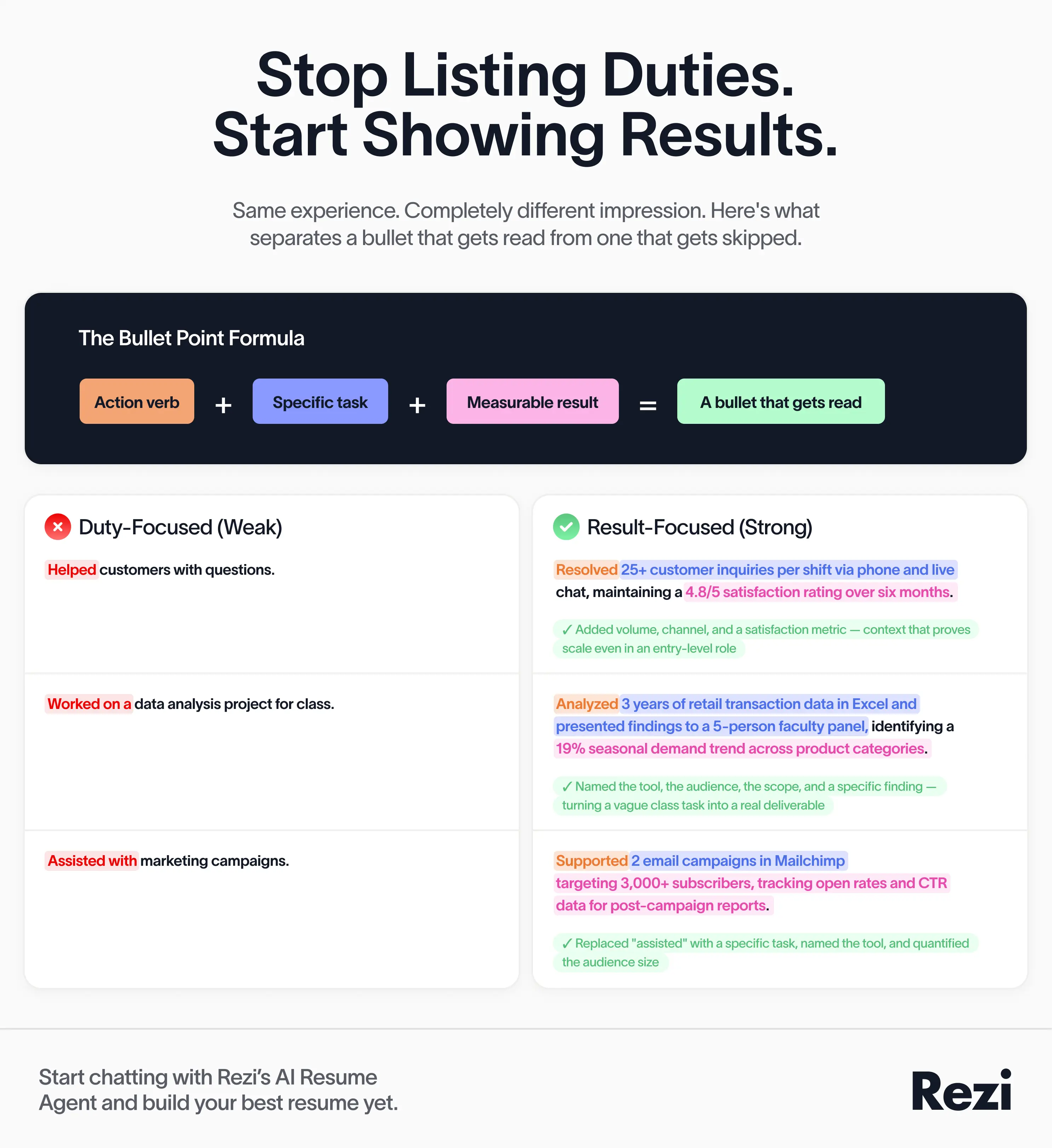 - [ ] Bullets follow the [verb] + [task] + [result/context] structure