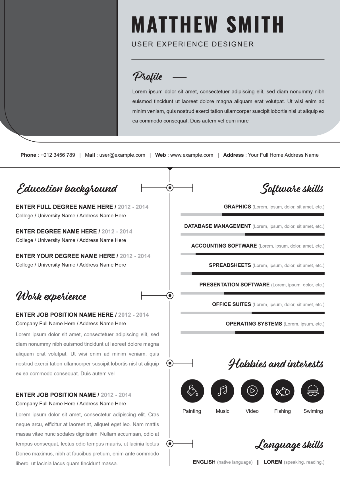 Comes with four pages, but you really only need one. The layout is sleek, but skip the photo and hobbies icons. Reorder the experience section and use bullet points for clarity. Leave out the references.