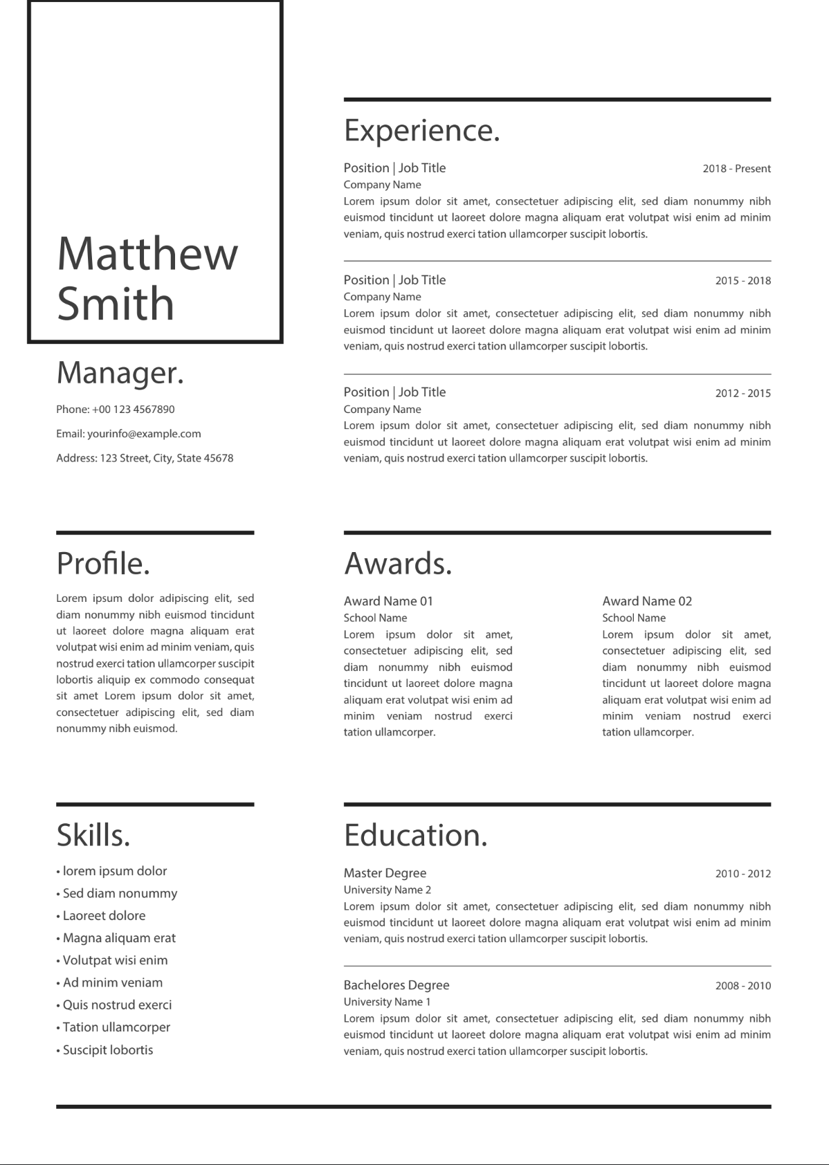 Simple, sharp, and professional. It includes space for a summary (which is great), but I’d swap out the references section and use that space more strategically. Also, replace skill bars with a clear list instead.