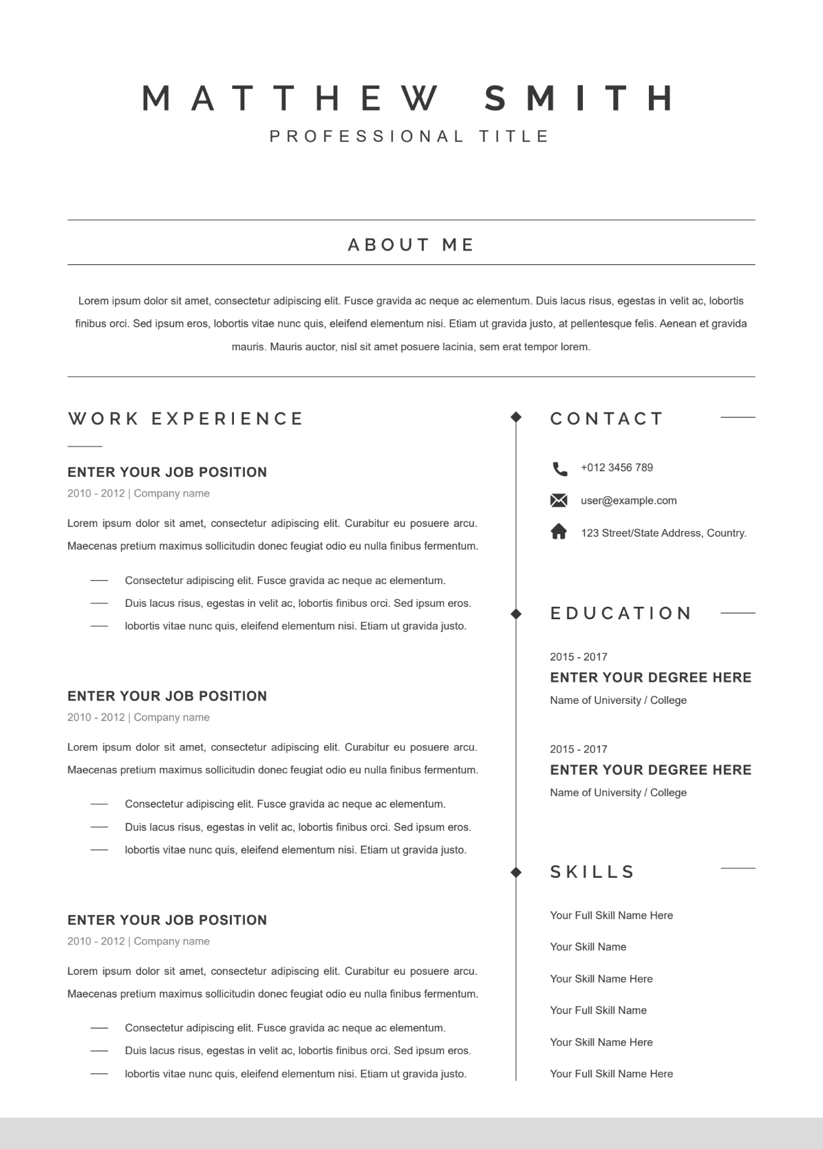 The two-column layout is smart — it keeps contact info, skills, and education tucked neatly on the side so your experience gets the spotlight. Swap out “About Me” (you’re not writing a book) for “Summary” or “Objective,” depending on your experience level.