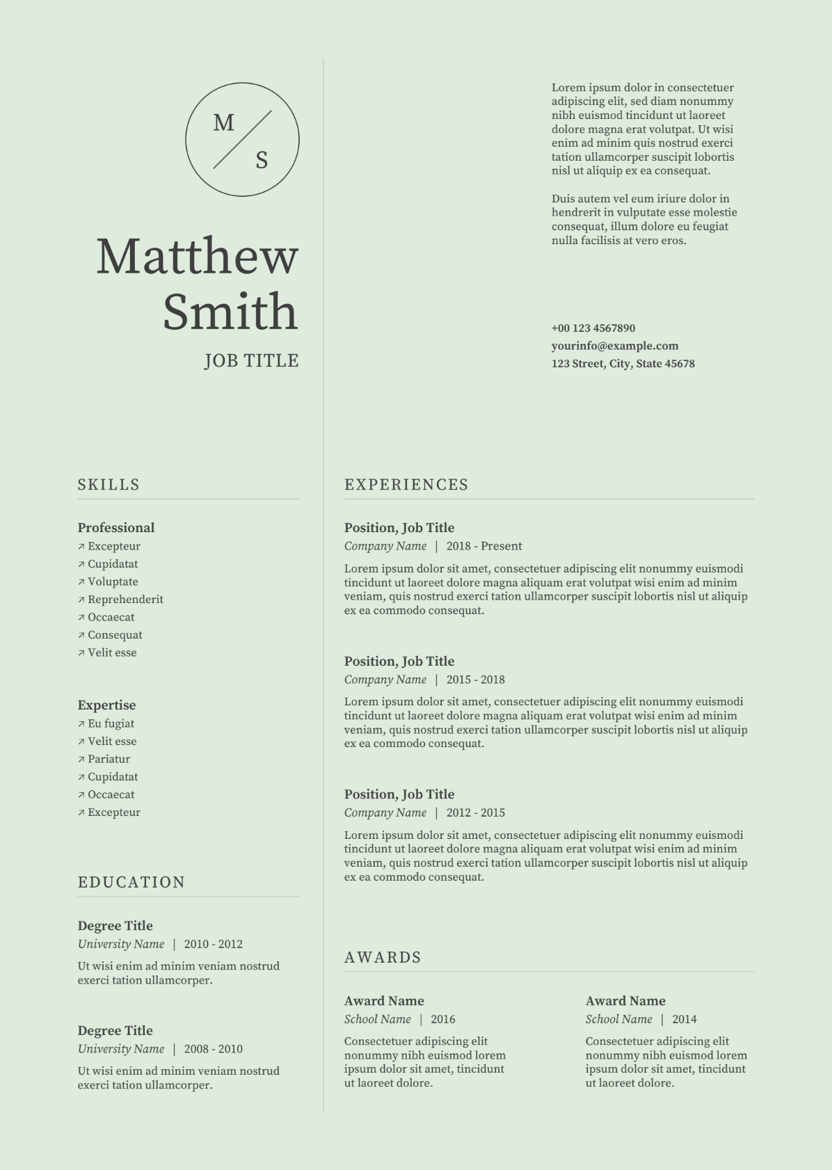 This one gives off a timeless, no-nonsense look. I like the monogram in the corner and how your name takes center stage. It’s easy to read, but be sure to break up your experience into bullet points to show your impact clearly.