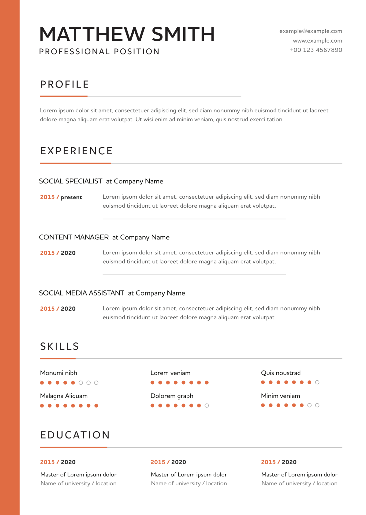 The orange highlights give it a nice punch without being too loud. I like how it emphasizes the dates, but if you want to shift the focus, feel free to highlight job titles instead.