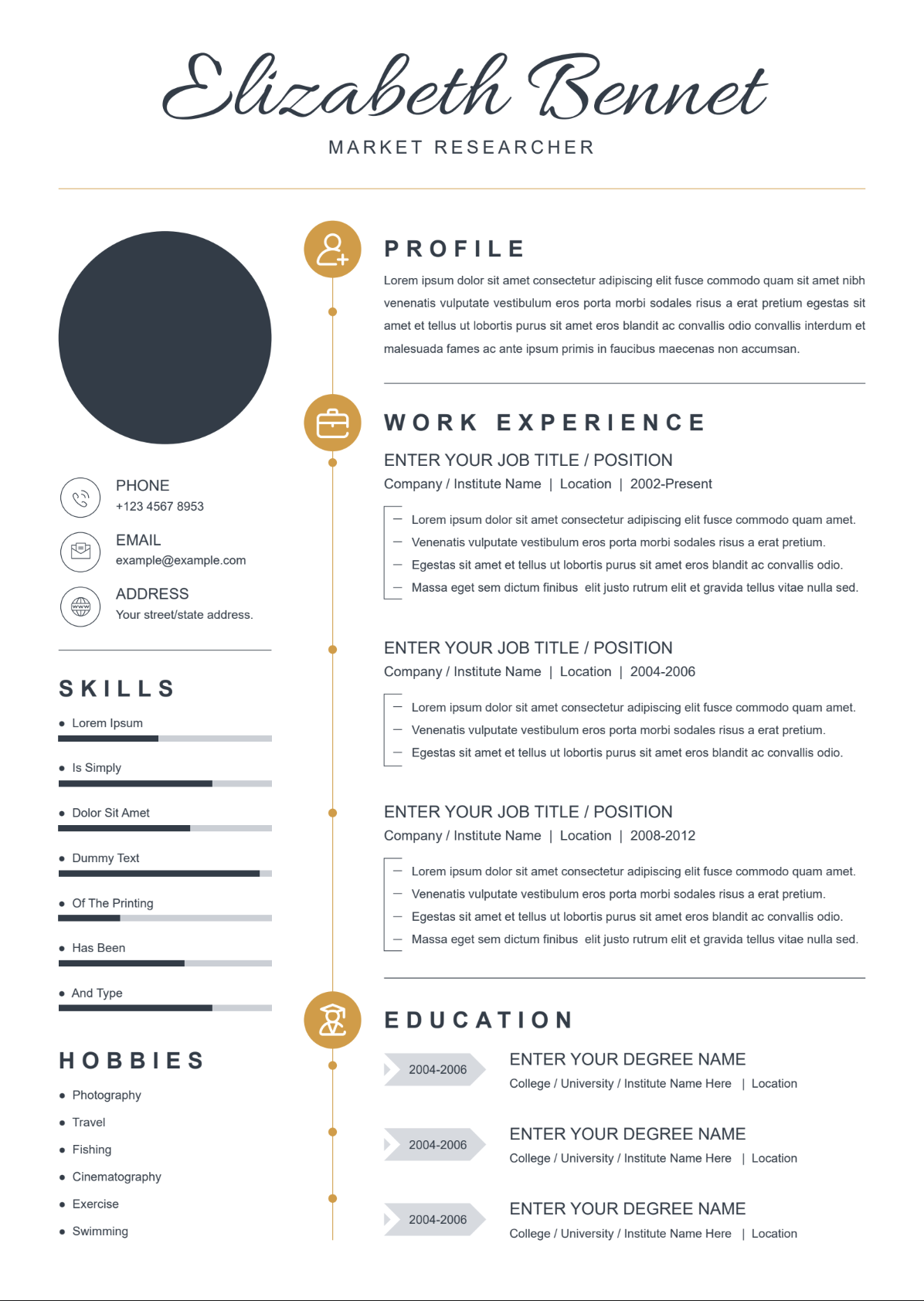 I like how clean and well-spaced this one is — the yellow headers make it super skimmable. If you’ve got solid experience, just list your degrees without details. Feel free to skip the hobbies section, and definitely ditch the references.