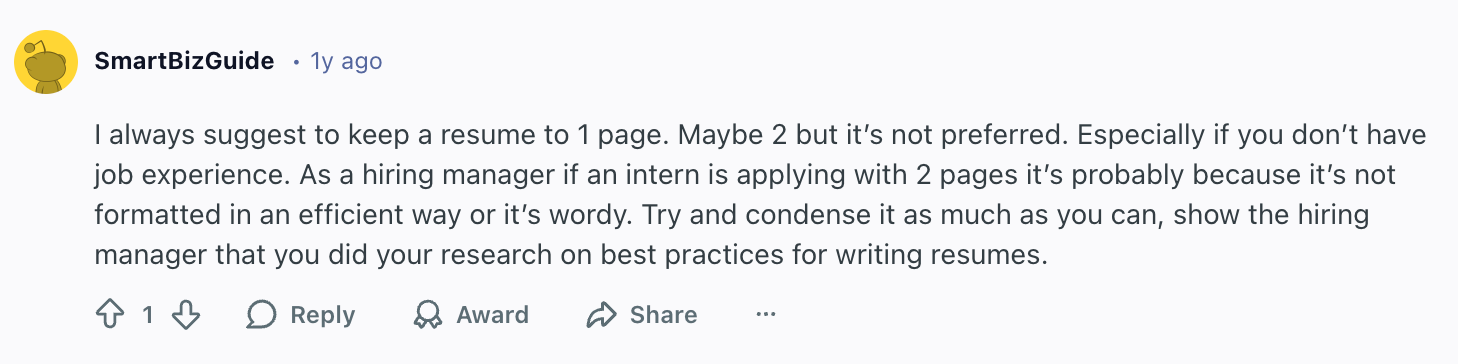 - Keep your resume to one page by focusing on the experiences, coursework, and projects most relevant to the internship. Quality over quantity makes you look organized and professional.