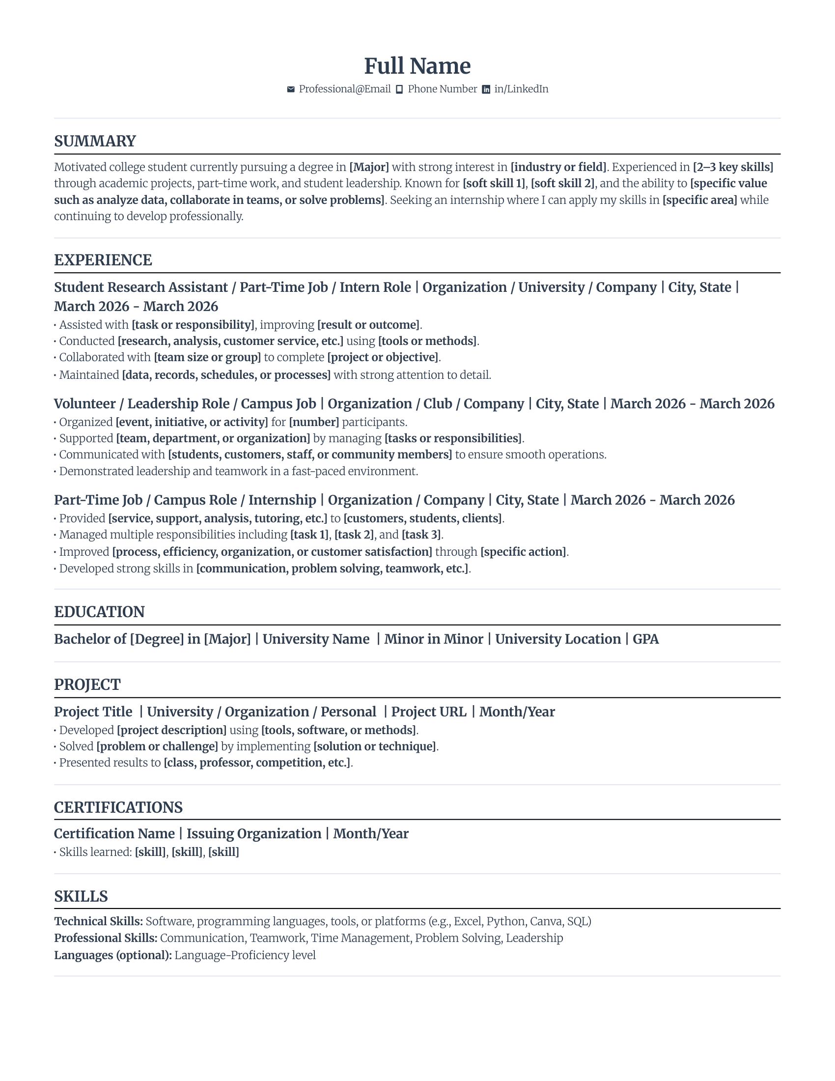 Your college resume should focus on your education, detailing your degree, major, and university, followed by any honors or scholarships. Use academic projects to show practical, job-related skills you’ve built in class. Relevant part-time jobs, volunteering, or student organizations can also demonstrate key soft skills and transferable abilities.