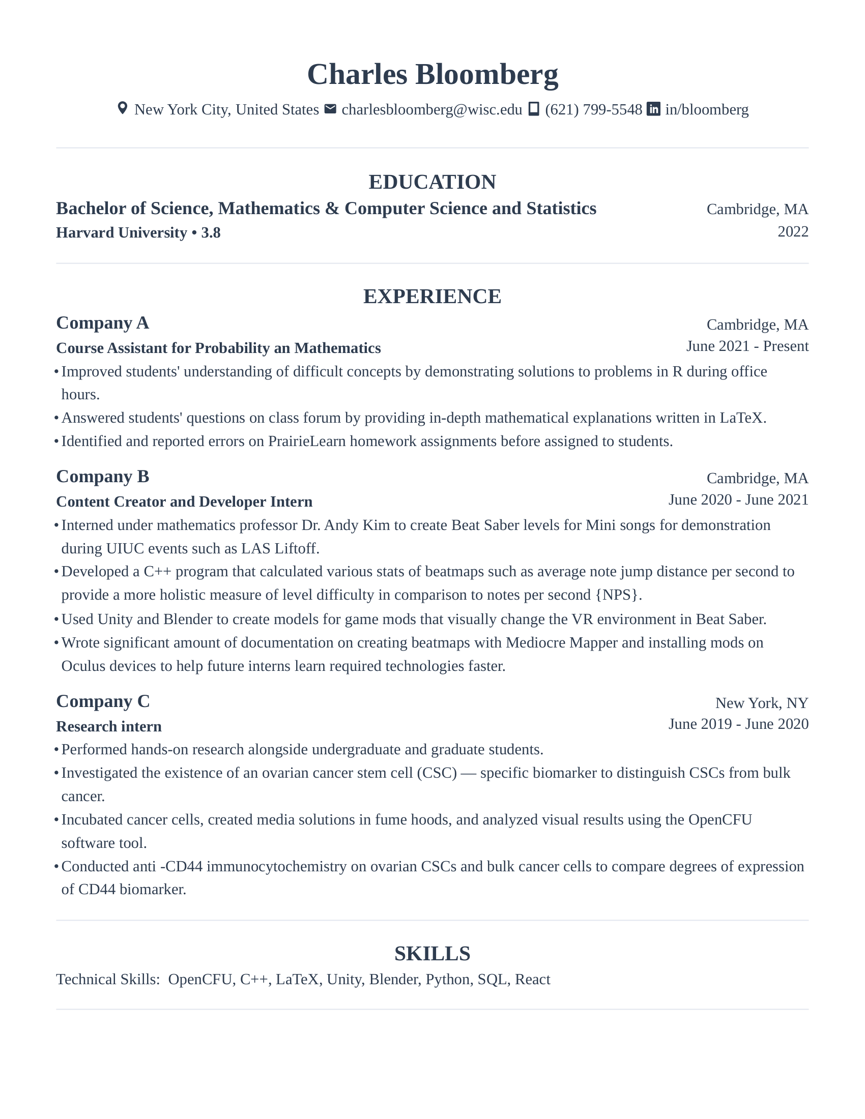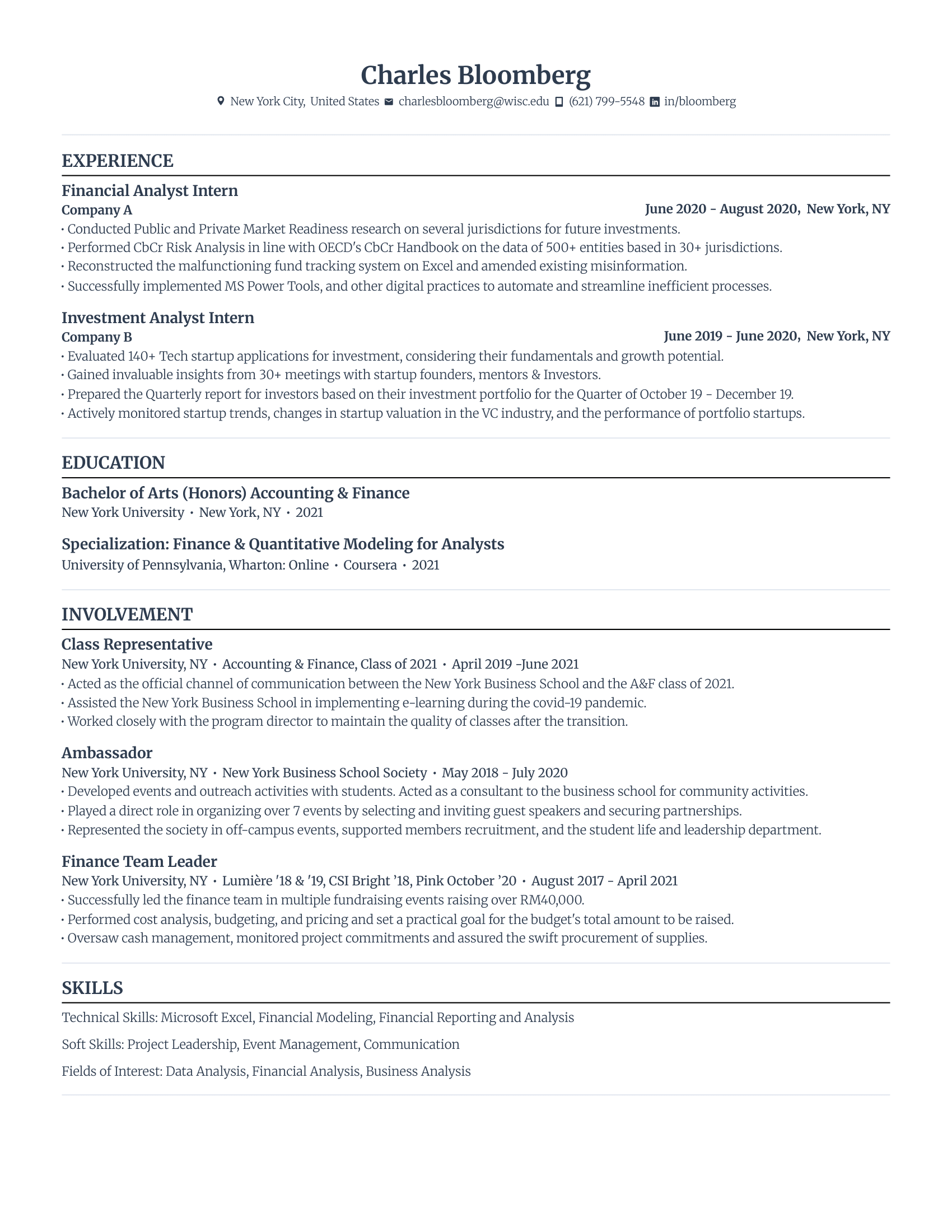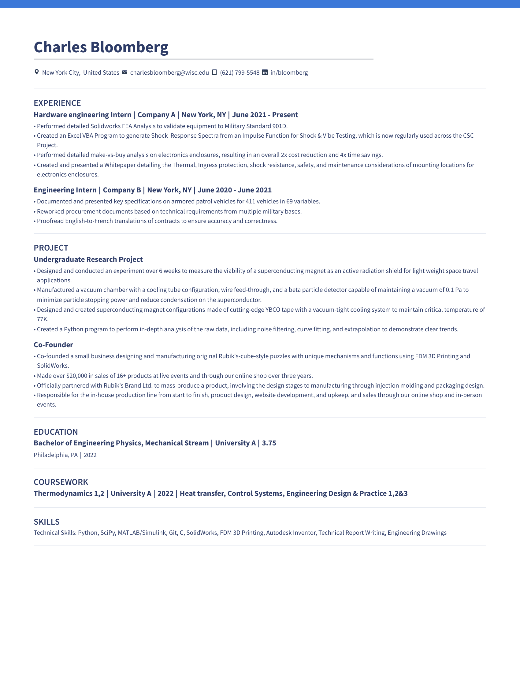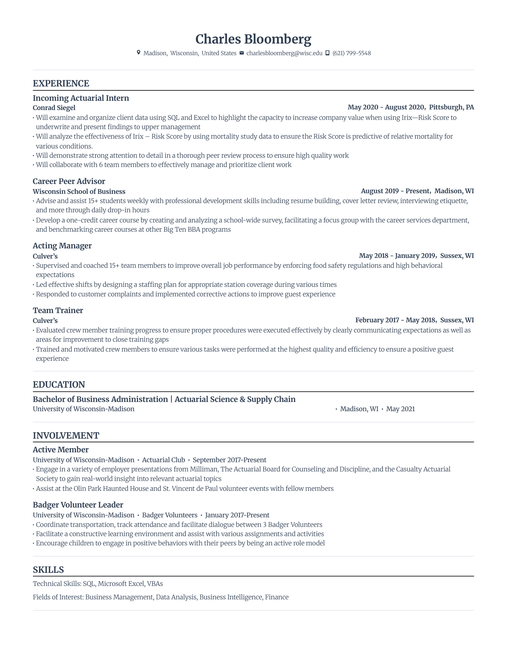 Technical Skills: Advanced Excel (Pivot Tables), Python, SQL, Cloud Computing, C++