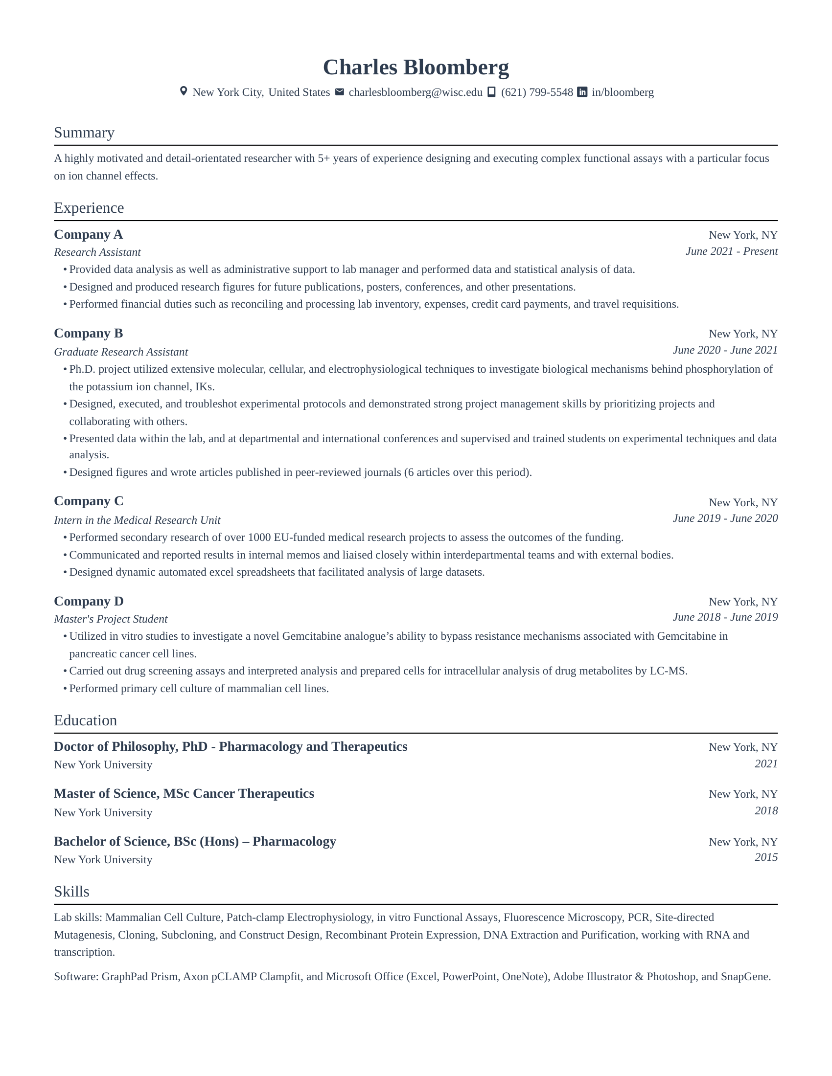In a research or academic intern resume, education usually comes first, followed by research experience and academic milestones. You can also include your thesis topics and relevant coursework. Early-career candidates can also list non-academic work to show transferable skills. Research resumes grow over time, so showing progress is as important as final results.