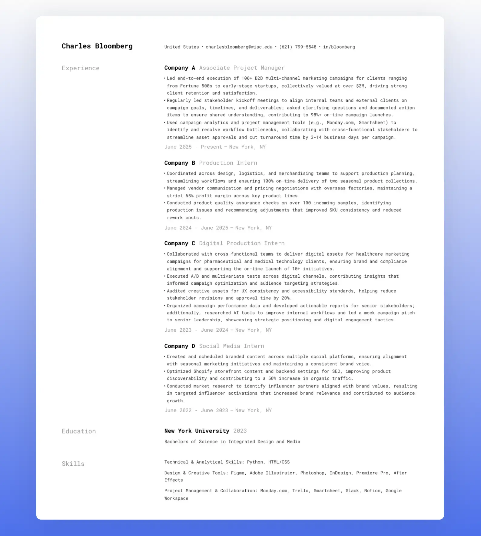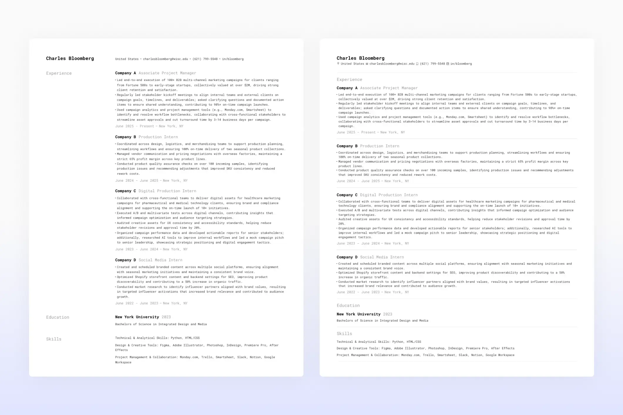 A single-column layout with horizontal dividers between sections. The full-width content area gives your bullet points and project descriptions room to breathe. No truncation, no awkward line breaks.