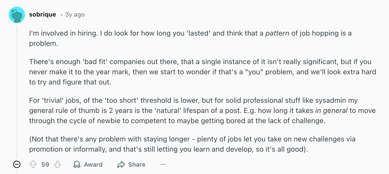 That said, switching jobs early in your career? Totally normal. I bounced between a cocktail bar, a historical archives center, and a pub in college, and nobody blinked. Later on, though, especially at senior levels, the same pattern can raise eyebrows.
