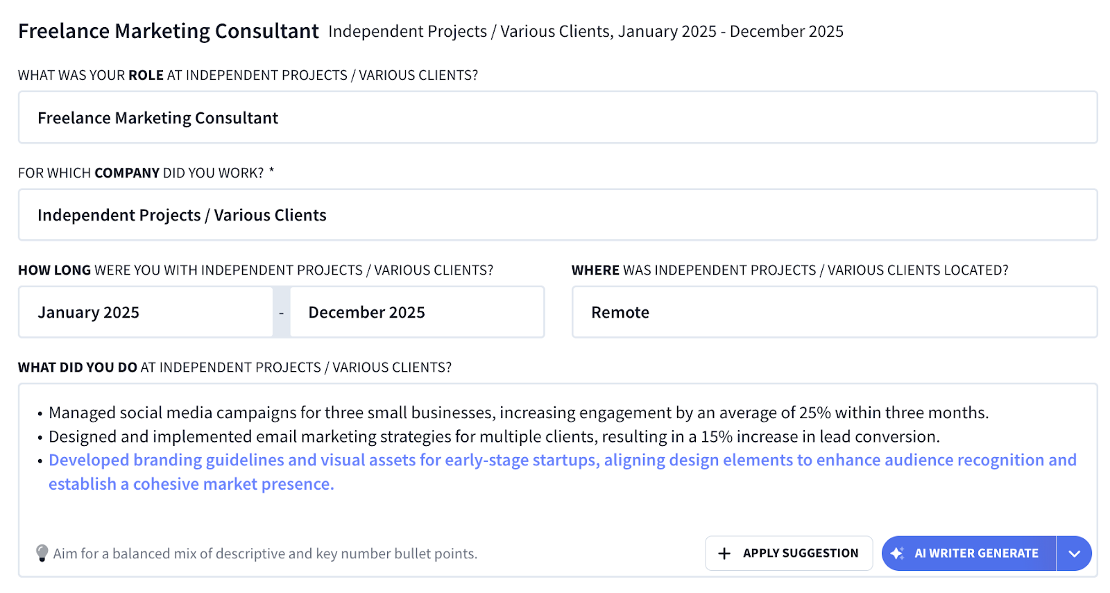 - Focus on achievements using AI Bullet Point Writer to highlight measurable results over vague responsibilities.