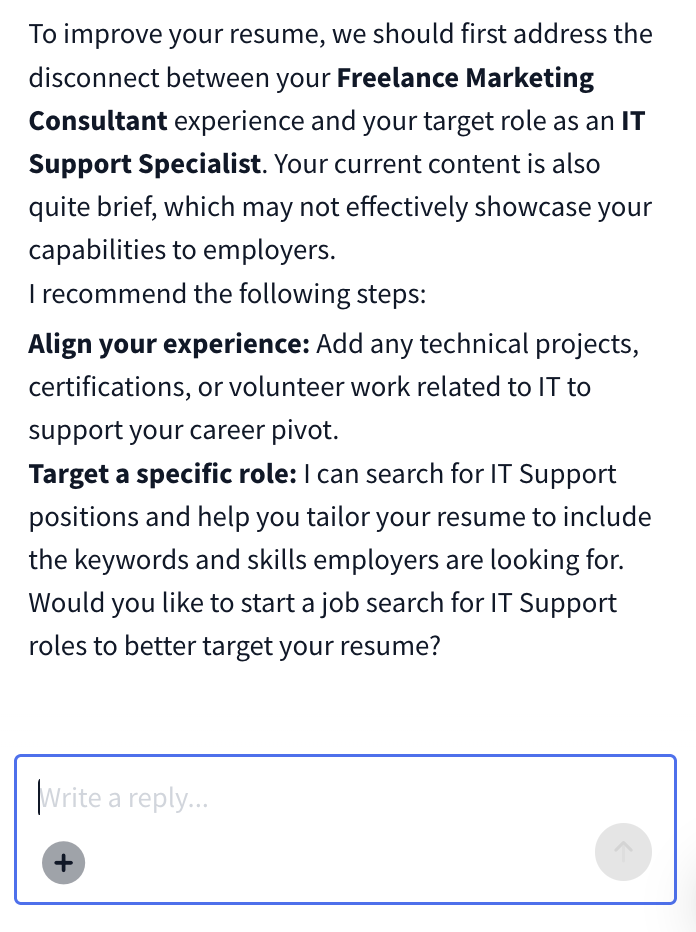 - The AI Resume Agent provides a personalized analysis of your resume and flags gaps, weak phrasing, or unclear progression.