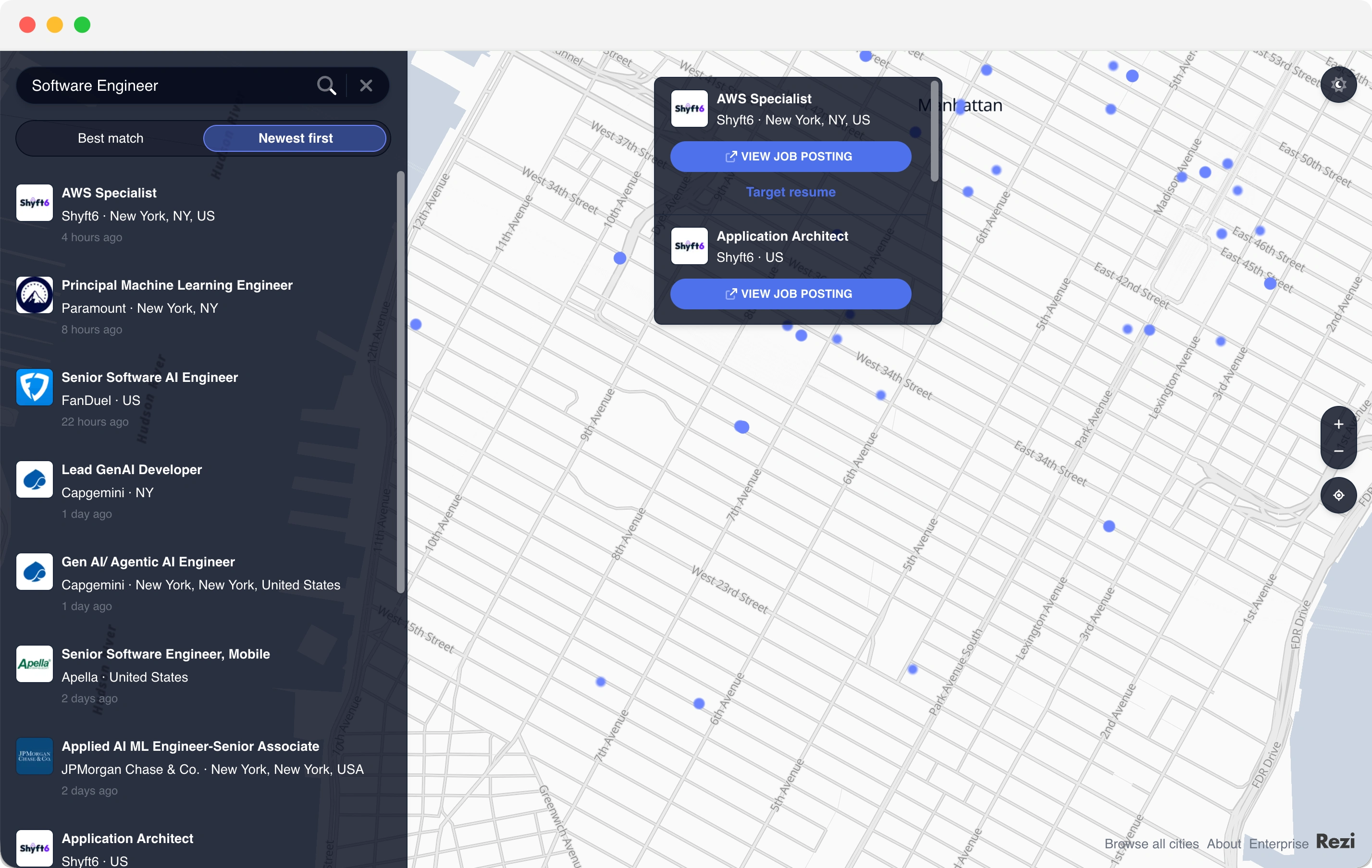 Go to map.rezi.ai and you'll see a world map with hundreds of jobs plotted across it. To filter the results, you can search by location, industry, and role using natural language to match the position you are looking for.