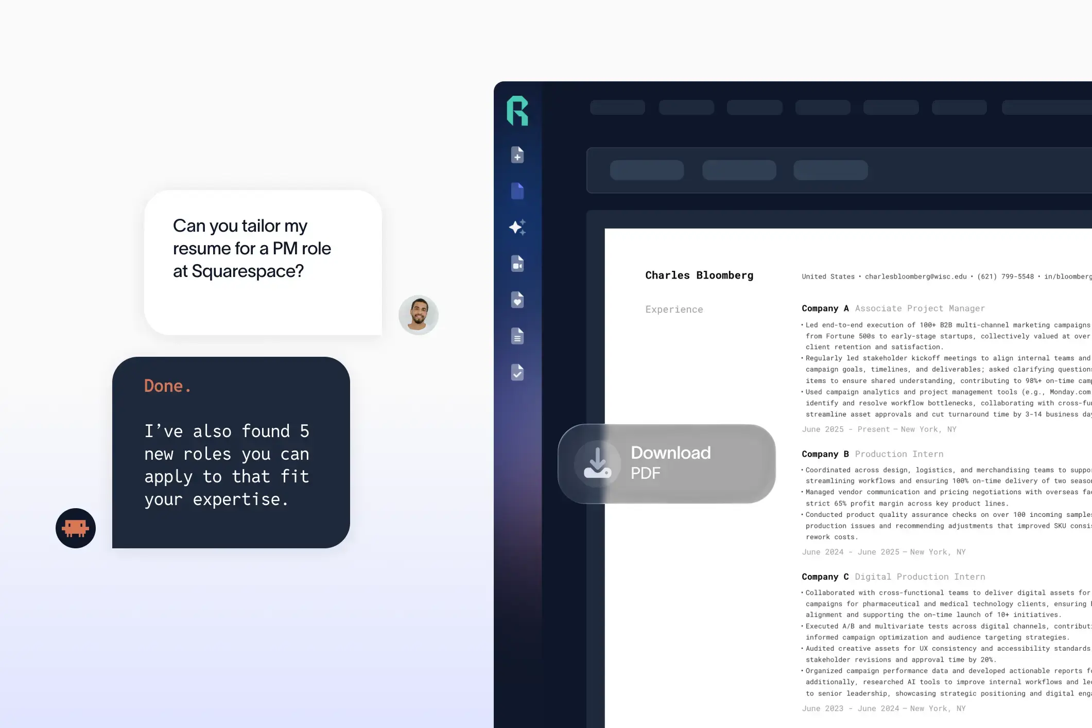 With job search, the workflow gets even smoother. You can say "find me senior product manager jobs in New York and tailor my resume to the best match." The agent searches for jobs, picks the strongest fit, pulls the full description, then rewrites your resume to match, all in one conversation.