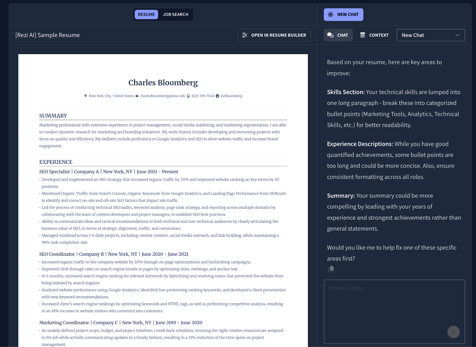 If you’re experimenting or want full creative control, ChatGPT can be a strong option. But if your goal is to create an application that meets hiring standards in minutes and gets through ATS reliably, Rezi provides all the resume writing and formatting tools you need for your job search.